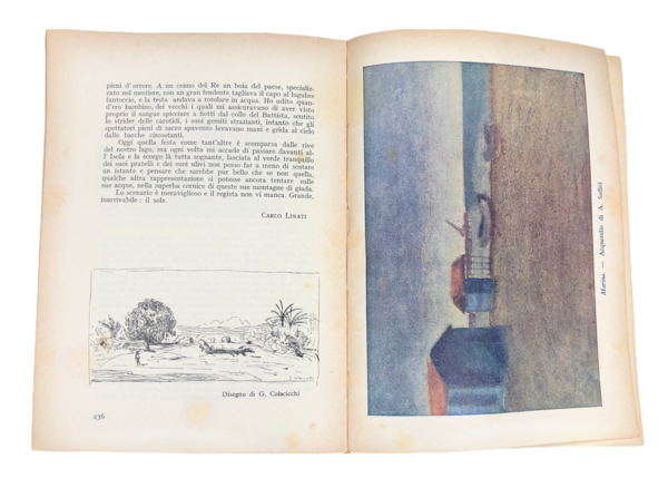 Brossura editoriale ill. bicolore in-8° (cm 21,8x15,6), pp. VIII, 323 + 14 TAVOLE a COLORI o bicolori fuori testo (Pasqui, Gino Carlo Sensani, Dani, Vagnetti, Salietti, CARRÀ ("Meriggio"), Tosi, G. Peyron, C. Vagarini, Soffici). Con 94 DISEGNI in bianco e nero nel testo di migliori pittori del '900, tra cui Lorenzo VIANI (2), Pietro Annigoni (3), Franco DANI (7: ricordi d'Africa), SOFFICI, Carrà (5), Tomea, CARENA (2 tavole), ROSAI (calciatori ecc.), CASORATI (tavola da puntasecca), F. Chiappelli, Manzù, Morandi, Abbigliati, Bacci, Bruno Becchi, Italo Griselli, D. Lotti, Pietro Parigi (5 xiilogr.), Romano Romanelli, Samminiatelli, Giorgio Settala, Vellani Marchi, G. Zetti, Scuola d'Arte di Firenze (13). Scritti di GOVONI ("Minerva splendente"), MARINETTI ("L'ora della velocità"), Baldini, Bo, Cecchi, Alfonso Gatto, Pratolini, Malaparte, Moravia, Palazzeschi ("Il Palio", ecc. Da notre la foto della "Libreria dei Visacci" nella Trattoria omonima. Parrebbero mancare le pagine 1-4, ma indice e quaderni dimostrano che non sono mai esistite. Prestigiosa e godibilissima galleria di ingegni. Ottimo esemplare.