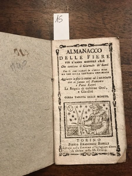 Almanacco detto delle fiere per l'anno bisestile 1808 che contiene il Giornale de' Santi, il levare del sole, le lunazioni, le fiere, ed i mercati che si fanno nel Piemonte, la regola per coltivar orti e giardini, e la tariffa delle monete