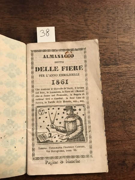 Almanacco detto delle fiere per l'anno embolismale 1861 che contiene il Giornale de' Santi, il levare del sole, le lunazioni, le fiere, ed i mercati che si fanno nel Piemonte, la regola per coltivar orti e giardini, e la tariffa delle monete Colla Regola di coltivar Orti e Giardini.