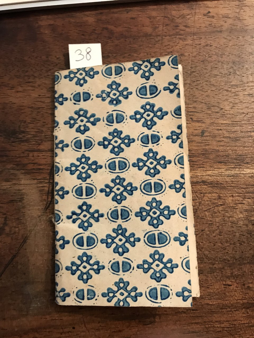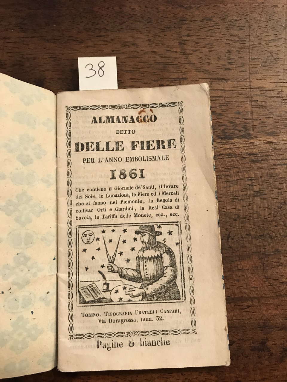 In-24°, pp. 24, 2 cc. bianche non utilizzate per annotazioni varie, bella vignetta xilografica di gusto popolare raffigurante un astronomo su uno sfondo di stelle, brossura in carta decorata.