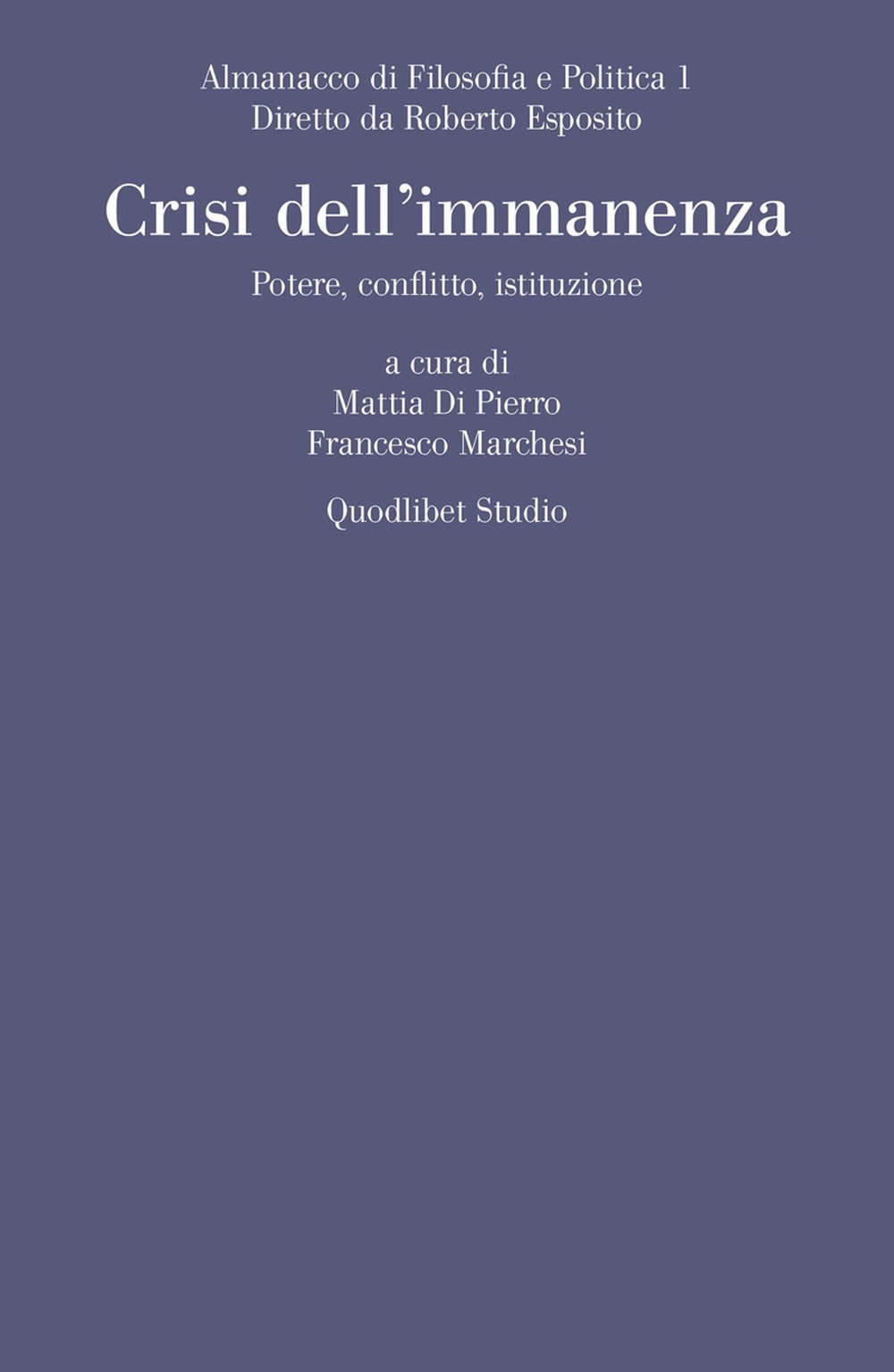 L'Almanacco di Filosofia e Politica, diretto da Roberto Esposito, intende costituire lo spazio aperto per una riflessione sulla politica — sul suo statuto, sulle sue crisi, sulle sue potenzialità — da un punto di vista filosofico. Non dunque ricerca storico-filologica sui concetti politici, né analisi empirica di carattere sociologico o politologico sulla cronaca politica. Ciò che l'Almanacco intende attivare è un'interrogazione rigorosamente filosofica sull'attualità. La domanda di fondo da cui nascono questi saggi riguarda la relazione tra la crisi globale della politica e i punti ciechi del pensiero contemporaneo. Quali paradigmi teorici hanno contribuito a provocare, o hanno reso possibile, tale cedimento? Ma scopo dell'Almanacco è soprattutto quello di elaborare nuove categorie capaci di riaprire un varco in un orizzonte apparentemente chiuso. Che contributo la filosofia può dare per inaugurare una nuova stagione politica? Il volume curato da Mattia Di Pierro e Francesco Marchesi, "Crisi dell'immanenza" — che ha per oggetto i concetti di potere, conflitto, istituzione —, consta di tre sezioni. La prima costituita da saggi di alcuni tra i più affermati filosofi contemporanei come Roberto Esposito, Donatella Di Cesare, Laura Bazzicalupo, Simona Forti, Christian Laval e Mario Tronfi; la seconda da interventi di studiosi più giovani riuniti in un progetto di ricerca collettivo; la terza da testi di autori ormai classici, quali Michel Foucault, Claude Lefort, Ernesto Laclau, inediti in italiano e concentrati sul rapporto tra politica e immanenza.