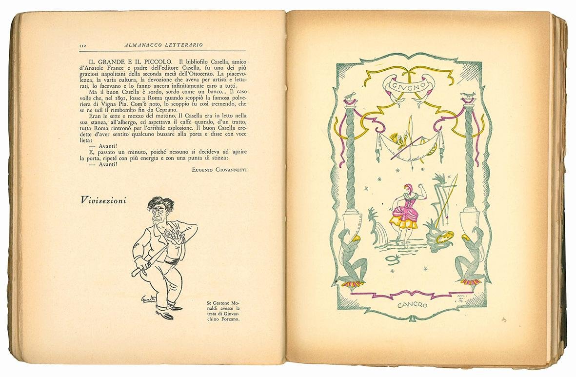 In 8vo (mm 201x150); pp. [8], 262, [5], 58-97, [1], XVII, [3], [76] c. di tav. fuori testo. Frontespizio stampato in rosso e in nero. Numerose illustrazioni in bianco e nero nel testo, opera dei migliori illustratori dell'epoca. 12 carte illustrate a colori raffiguranti i diversi mesi e i segni zodiacali, 64 carte di inserti pubblicitari fuori testo. Carta uniformemente brunita, piccoli strappi marginali che tuttavia rimangono ben distanti dal testo. Brossura editoriale illustrata a colori realizzata da B. Angoletta. Minime mancanze al margine delle copertine e al dorso, ma nel complesso bell'esemplare in barbe.