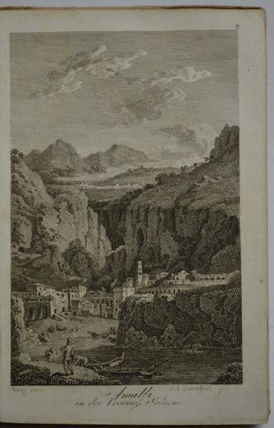Cm. 14, pp. 222 (4). Con ritratto di Wieland all'antiporta, 4 (di 6?) tavole di costumi femminili, 4 tavole raffiguranti le stagioni e 9 tavole raffiguranti luoghi della Campania (Minari, Amalfi, Capri, Ischia, Napoli. Castellamare) la Grecia antica (tempio di Minerva, l'Acropoli) ed un facsimile d'autografo. Il tutto finemente inciso in rame su tavole f.t. Legatura originale in cart. rigido. Tagli dorati ed entro custodia. Mancanze superficiali al dorso, peraltro ben conservato.