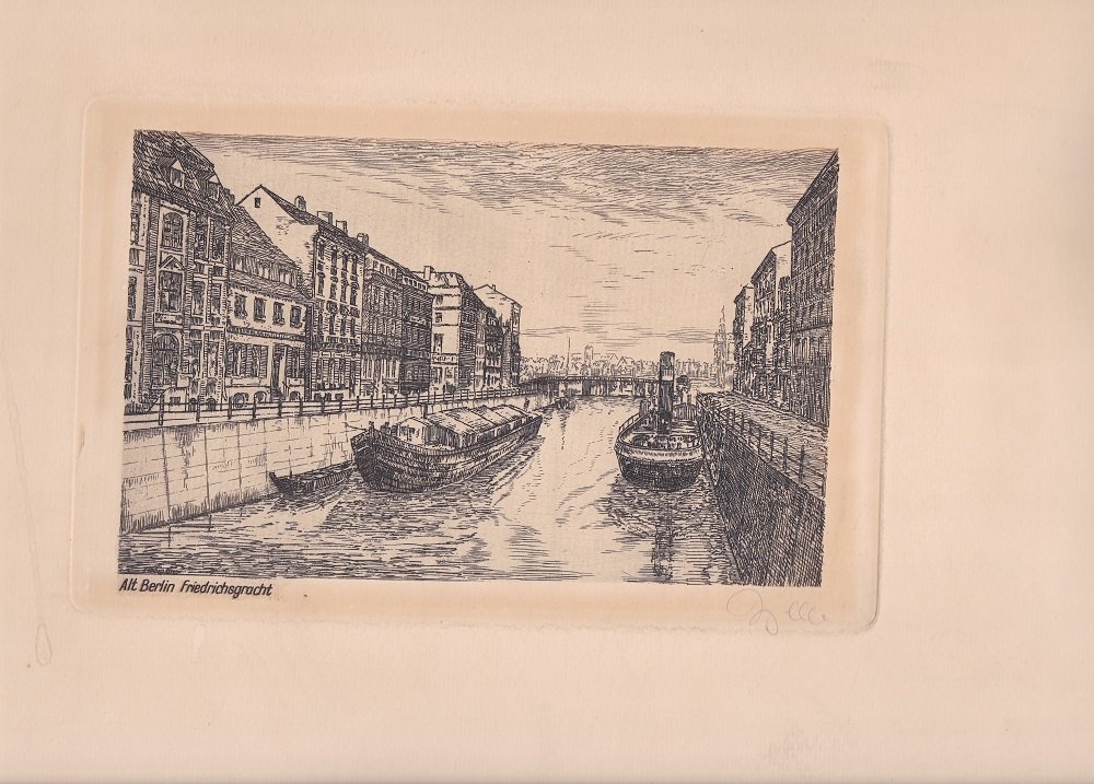 Die Radierung wurde am unteren Bildrand vom Künstler signiert, im Bild selbst (unten links) findet man das Kürzel "Fiebig". Maß der Radierung: ca. 13,6 x 21,7 cm. Die Radierung ist vermutlich nach einer Fotografie entstanden, die Bebauung der Friedrichsgracht ist in den 1960er Jahren (in der DDR) abgerissen worden.