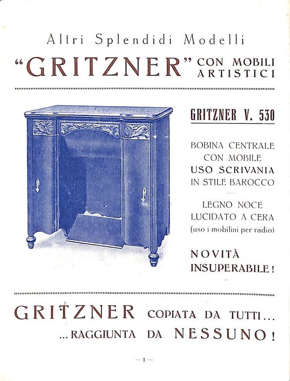 Pieghevole pubblicitario di 6 facciate (aperto misura cm 37 x 16) con 6 illustrazioni con modelli di macchine da cucire Gritzner con mobiletti e note tecniche. Non datato ma ascrivibile agli anni Dieci circa.