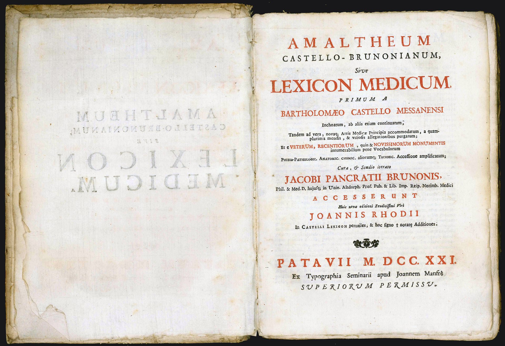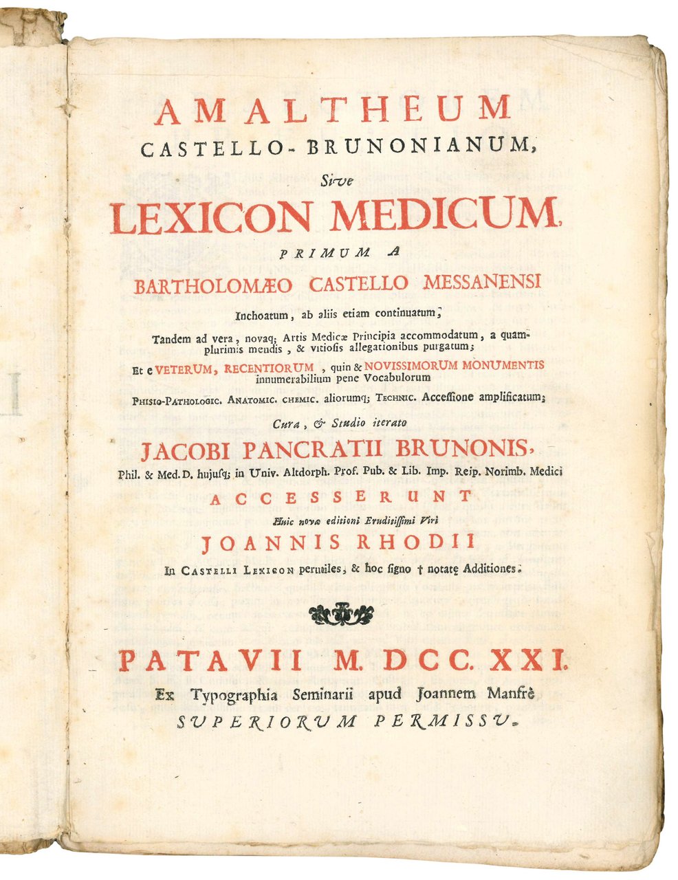 Amaltheum Castello-Brunonianum, siue lexicon medicum primum a Bartholomæo Castello Messanensi inchoatum, ab aliis etiam continuatum, tandem ad vera, nouaque artis medicæ principia accomodatum ... cura, et studio iterato Jacobi Pancratii Brunonis, ... Accesserunt huic novæ editioni eruditissimi viri Joannis Rhodii in Castelli lexicon ... addittiones.