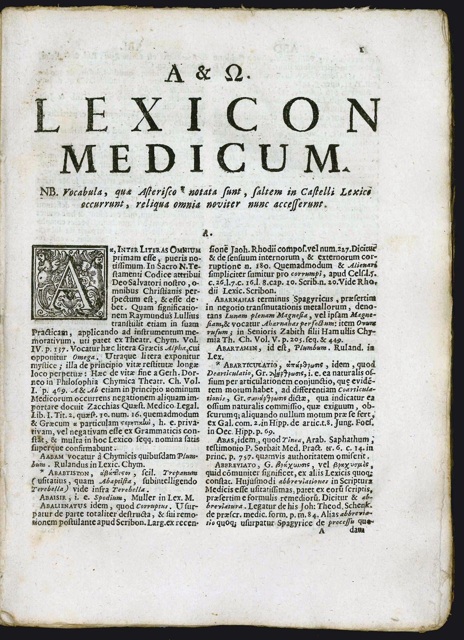 Questo importante Lessico Medico plurilingue uscì per la prima volta a Messina nel 1599 col titolo di Lexicon medicum Graeco-Latinum ed ebbe numerose edizioni. Nel 1682 fu ristampato a Norimberga con le aggiunte e la Nomenclatura Exaglotta del medico svizzero J. P. Bruno. Dal 1699 fu stampato varie volte a Padova e in altre città d'Europa con le aggiunte di J. Rhodius. Ancora nell'Ottocento l'opera era consultatissima. Questa 1è l'edizione definitiva.