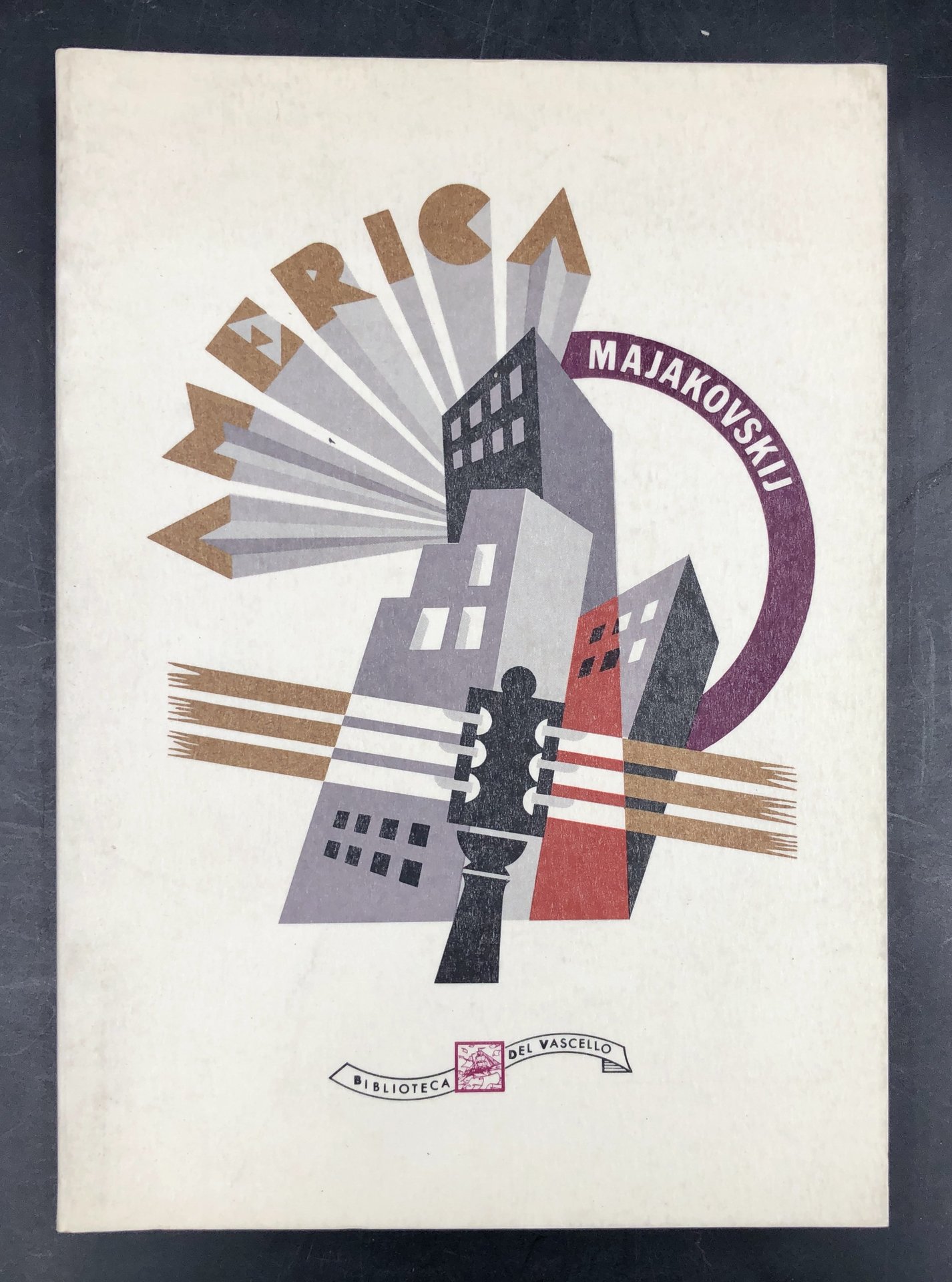 Cartoncino lewggero editoriale con spettacolare grafica futurista a COLORI al piatto. /n-8° (cm. 20,5x15)190, (8) con 14 ILLUSTRAZIONI (6 FOTO, riproduzioni di grafiche e DISEGNINI in bianco e nero). MAJAKOVSKIJ, poeta, scrittore, drammaturgo, regista teatrale, attore, pittore, grafico e giornalista sovietico, cantore della rivoluzione d'ottobre e maggior interprete del nuovo corso intrapreso dalla cultura russa post-rivoluzionaria. Nel maggio del 1925 partì alla volta dell'America, che raggiungerà nel luglio dello stesso anno per trattenervisi circa tre mesi annotando versi e impressioni su un taccuino. Tornato in URSS pubblicò 22 poesie del cosiddetto Ciclo americano su alcune riviste e giornali nel periodo compreso tra il dicembre del 1925 e il gennaio 1926 e gli scritti in prosa nel 1926 con il titolo di La mia scoperta dell'America. Da questi scritti l'atteggiamento di Majakovskij nei confronti degli Stati Uniti appare contraddittorio, passa infatti da momenti di entusiasmo e attrazione ad altri di rabbia per le condizioni di semischiavitù degli operai delle fabbriche. Ottime condizioni