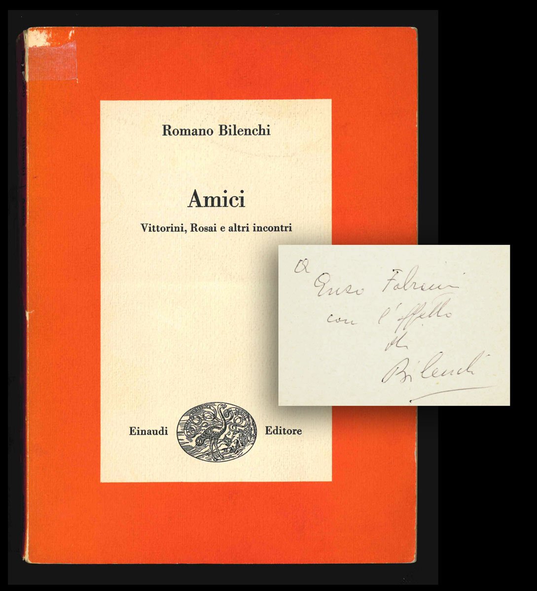 LIBROPrima edizione.CON AUTOGRAFO.Esemplare pregiato da invio autografo dell’autore al poeta milanese Enzo Fabiani vergato al piede del frontespizio; riparazione amatoriale con nastro adesivo alla testa del dorso, leggermente piegato; per il resto in più che buone condizioni (alcuni segni d’attenzione indelebili ai lati del testo su Vittorini).Raccolta di prose: «Torino 1931» (su Maccari, Mucci e il gruppo torinese del «Selvaggio»); «Rapallo 1941» (su Ezra Pound); «Il Marchese» (su Rafael Lasso de la Vega, Marquis de Villanova»; «I silenzi di Rosai» (via Toscanella; via di Villamagna; via San Leonardo); «Vittorini a Firenze»; «Notti d’agosto»; «Padre e figlio» (su Mario Francesconi); «Primo incontro con Marcucci» (su Mario Marcucci).