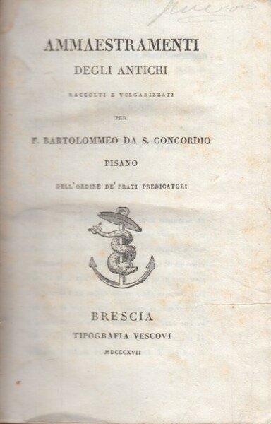 Ammaestramenti degli antichi raccolti e volgarizzati per F. Bartolommeo da S. Concordio Pisano dell'ordine de' frati predicatori