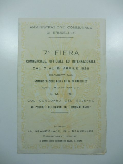 Pieghevole pubblicitario di 4 facciate (ciascuna misura cm 15 x 23) con cartina del Belgio nelle due pagine interne e foto in bianco/nero all'ultima facciata. Pubblicita' della fiera commerciale di Bruxelles svoltasi nell'aprile del 1926.