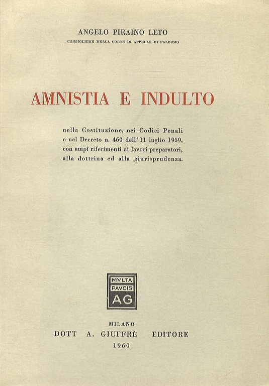 Amnistia e indulto nella Costituzione, nei Codici Penali e nel Decreto n. 460 dell'11 luglio 1959, con ampi riferimenti ai lavori preparatori, alla dottrina ed alla giurisprudenza.