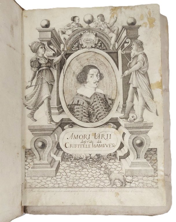 >in-8,  ff. 250 ca. n.n.; legatura coeva in cartone rustico muto. Volume manoscritto di poemi amorosi probabilmente inediti; adorno di un bellissimo titolo-frontespizio su pergamena, con ritratto dell'autore entro ovale circondato da figure allegoriche entro struttura architettonica,  in alto emblema con motto "Lesser non mut", il tutto realizzato da Antonio Crisriano Orligero "Ad effigiem quantum quidem calamo potuit ad vivum delineavit auth. Christianus Orlingerus". Ad una prima sommaria ricerca non ci risulta alcuna notizia su Crifitele Isamiveto, né su Christianus Orlingerus. Interessante raccolta vergata in leggibile minuscola corsiva.