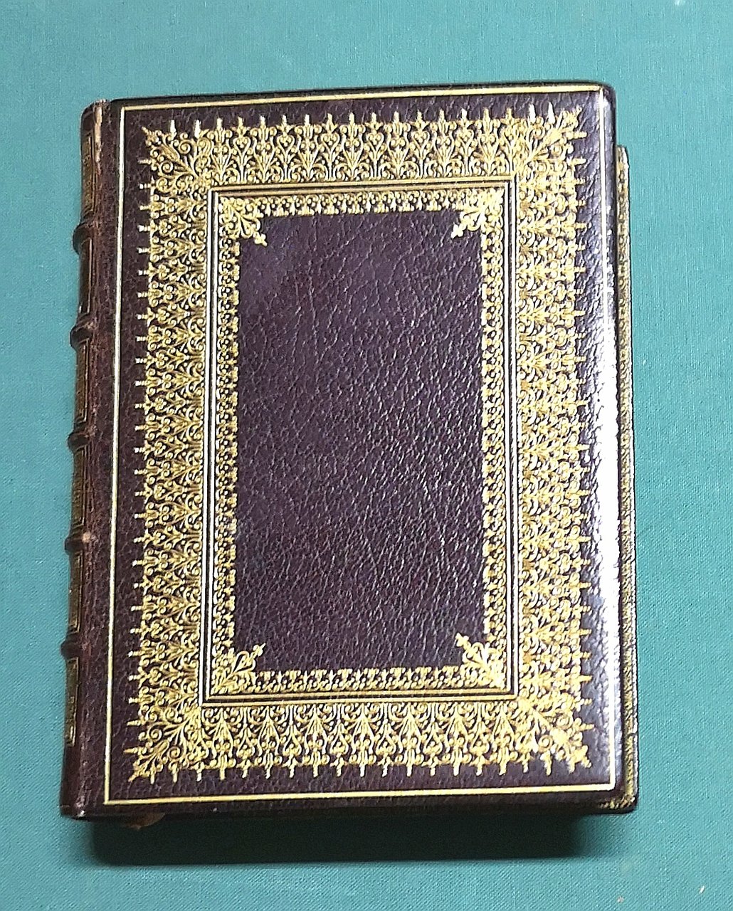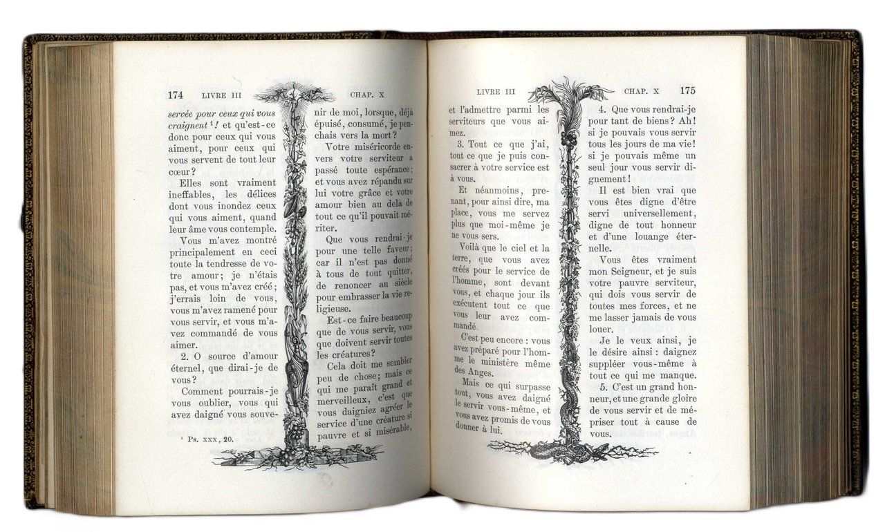 >in-8 carré, pp. 252, testo su due colonne divise da graziose colonne ornamentali in 12 differenti versioni, 16 tavole a p. pagina protette da velina. Superba legatura in marocchino bruno, dorso a nervi ornato da piccolissimi ferri e titolo, entrambi in oro, elaborata e finissima doppia cornice vegetale in oro ai piatti, dentelles dorate interne, sguardie in seta, tagli dorati. Bella ed elegante edizione di gusto romantico, illustrata da Doré e ornata da Giacomelli. Perfetto esemplare in stupenda legatura.