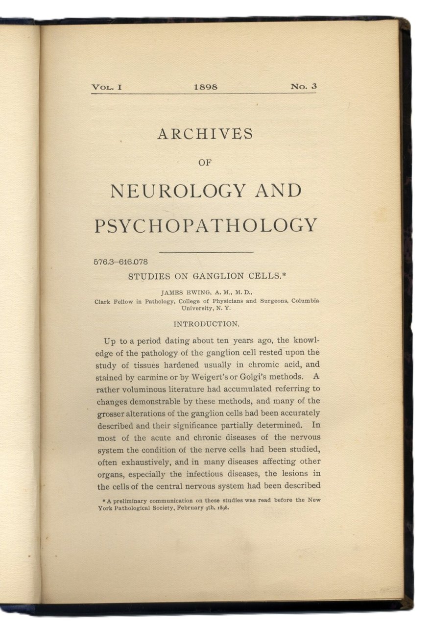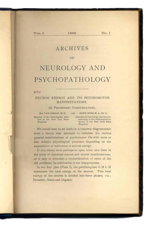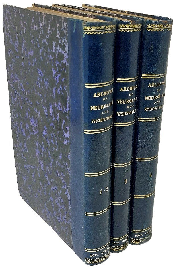 >4 parti in 3 volumi in-8, pp. 714 con numerazione continua, tavole esplicative ripiegate f.t.  Legatura coeva in mezza pelle blu, titoli in oro al dorso. Prima edizione del primo anno di questa prestigiosa rivista pubblicata dalla State Hospitals Press di Utica, New York (uscì dal 1898 al 1900), che si focalizzava sull'intersezione tra malattie del sistema nervoso e disturbi mentali. Curata da G. Alder Blumer e Ira Van Gieson, faceva da ponte tra la neurologia e gli albori della psichiatria. Tra le  diverse patologie citate: depressione, epilessia, paralisi, atereo sclerosi, tumori cerebrali, stati di paranoia. Ottimo esemplare.