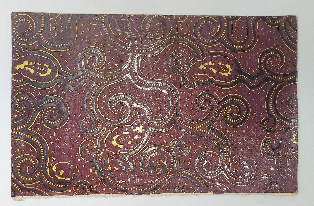 >Foglio (mm 183x127) di carta decorata e dipinta a mano. Motivo cachemire sfondo vinaccia. Ben conservato.