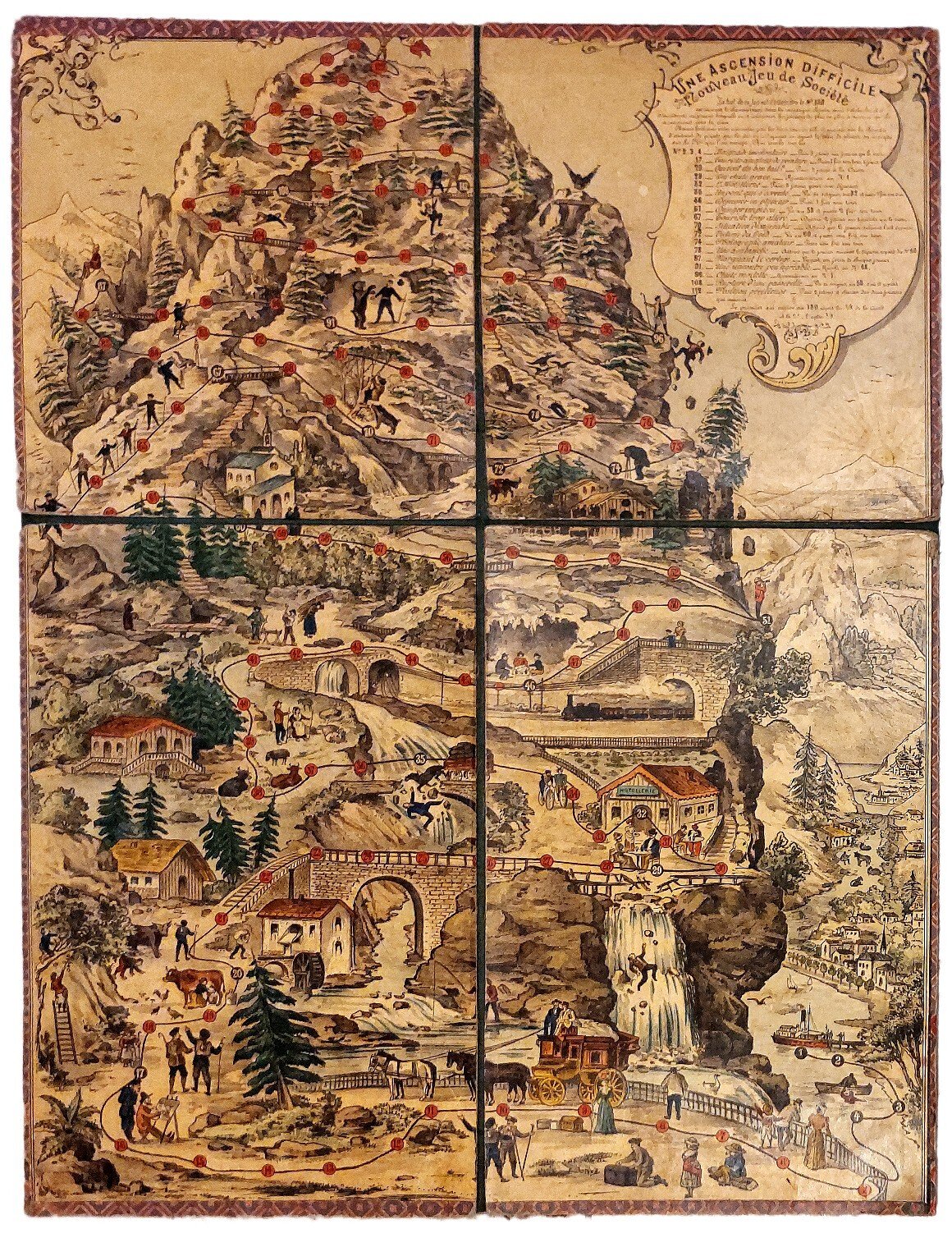 >Grande plancia da gioco in cartone ripiegato in 4 (650x500 mm). In alto a destra entro cartiglio la leggenda con le regole da seguire. Esistono due versioni della tavola (una del 1895, l'altra registrata nel 1917). Il Gioco si articola intorno ad un percorso di 130 caselle, inframmezzate da numerosi imprevisti e conseguenti punizioni: caselle n. 2,3,4 Baignade involontaire. Paie 3 jetons au jouer qui le suit; n. 29 Une chute grave. Recommence au N. 1; n. 72 Victime du froid. Va au 60 et passe une fois son tour… Si parte da un laghetto e si deve riuscire a raggiungere la vetta della montagna. E' presente la sola tavola del gioco, il gioco originale infatti prevedeva la scatola, i 6 alpinisti di metallo, 34 fiches rotonde di osso, 19 fiches rettangolari di osso, 2 dadi di osso. Esemplare con tracce d'uso ma in buono stato di conservazione (angoli inferiori restaurati, due graffi nel quadrante inf. sx. della tavola). Considerato che le regole sono enunciate direttamente sulla plancia, usando altre pedine è assolutamente giocabile.