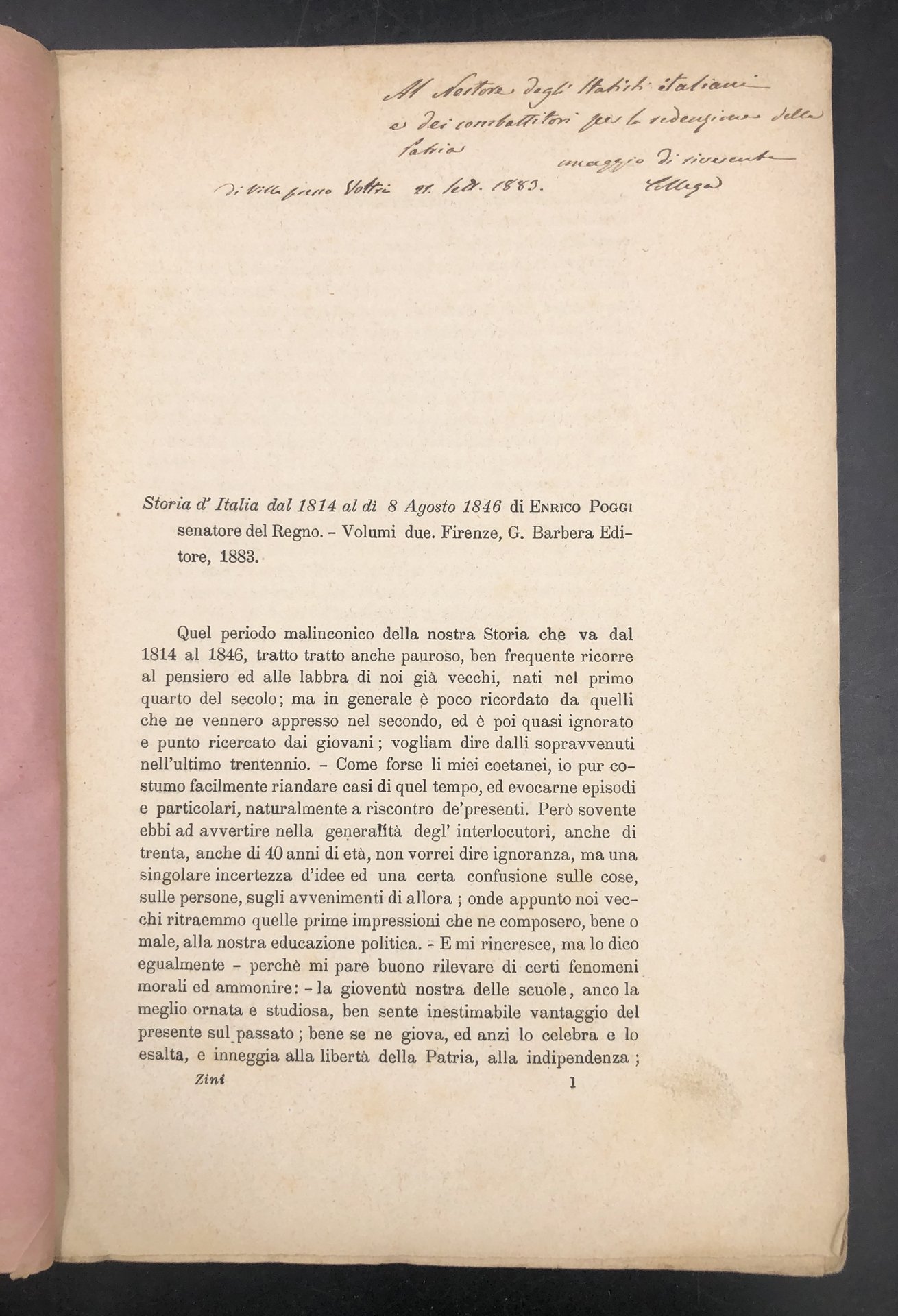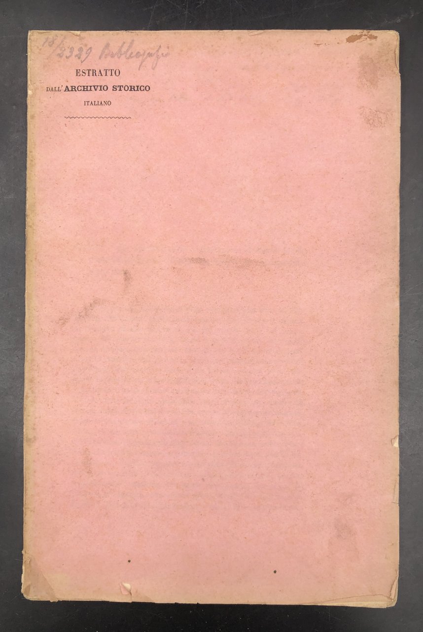 Alla prima pagina, DEDICA AUTOGRAFA dell'Autore "al Nestore degli Statisti italiani [Paolo Boselli fu così definito in un libro di Bernardo Chiara] e dei combattitori per la redenzione della Patria omaggio di riverente collega. Di Villa presso Voltri 21 Sett, 1883". Corposo estratto originale dall'Archivio Storico Italiano. In-8° (cm. 23,7), pp. 44. Brossura rosa edit., con testata a stampa al piatto ant. e presentazione della rivista al piatto post. Usure alle cuffie ma ben cucito ed intonso. ZINI, prefetto in varie province, poi senatore, cofondatore del giornale "L'Indipendenza italiana" (1848) collaboratore di molte riviste storiche e letterarie, socio della Deputazione di storia patria per le antiche province modenesi