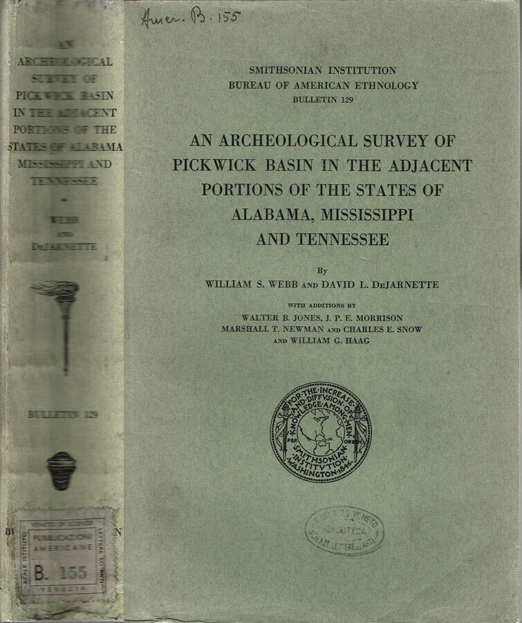 Bulletin 129 della collana Smithsonian Institution Bureau of American Ethnology. Autori: William S. Webb e David L. DeJarnette, con aggiunte di: Walter B. Jones, J. P. E. Morrison, Marshall T. Newman, Charles E. Snow, William G. Haag. Volume degii anni '40 del '900 in stato discreto, coperta illustrata in cartoncino, su piatto anteriore catalogazione bibliotecaria manoscritta e timbro ex biblioteca, sul dorso talloncino in carta con catalogazione bibliotecaria, qualche segno del tempo, tagli leggermente ambrati con tracce di fioritura, gora su quello di piede, cerniera stretta, pagine ben conservate, lieve sentore di muffa. Presenta antiporta con cartina in nero fuori testo, timbro ex biblioteca su frontespizio e sul margine di piede di qualche pagina, timbro numerale su excipit, figure in nero, CCCXVI tavole, su carta patinata, con illustrazioni in b. e n., XX tavole fuori formato, ben piegate. Numero Pagine 536