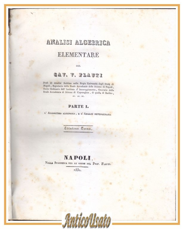 ANALISI ALGEBRICA ELEMENTARE Volume I di Vincenzo FLAUTI 1830 Libro antico