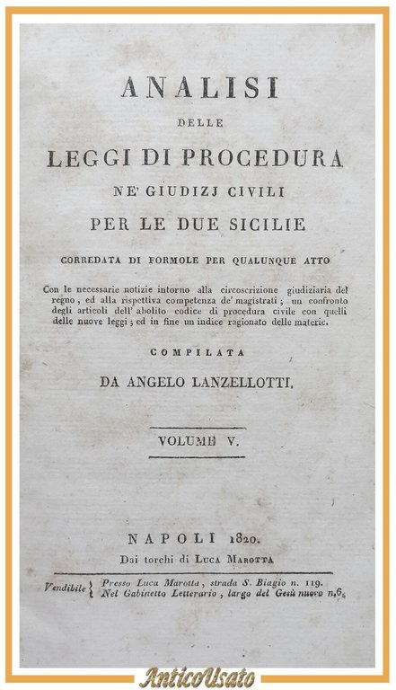 ANALISI DELLE LEGGI DI PROCEDURA NE' GIUDIZI CIVILI PER LE DUE SICILIE di Angelo Lanzellotti. Volume V + indice rilegati insime.