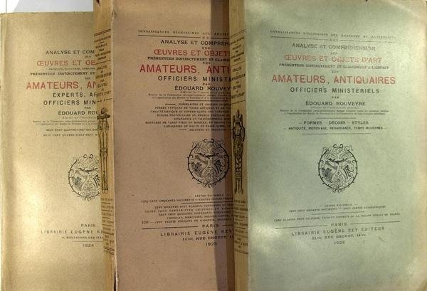 Librairie Eugène Rey éditeur, Paris, 1924-25-26. 3 volumes in/4 (25 x 16 cm) brochés, couvertures imprimées, très nombreuses illustrations en noir, 302 pages, 304 pages & 304 pages. Porcelaines et bronzes orientaux, formes de vases antiques et en majolique, caractéristiques et contrefaçons des fayence de Bernard Palissy, écoles provinciales du meuble français au 16è, dinanderie et chaudronnerie historiées, montures de vases fixes ou mobiles, bronze ciselé et doré, tapisserie de haute et basse lisse, savonnerie, recettes et procédés ; formes, décors, styles, antiquité, moyen-âge, renaissance, temps modernes. Une documentation complète avec dans le vol. 1 : 990 documents graphiques, 887 marques et poinçons - vol. 2 : 550 documents, cartes géographiqes, 168 blasons couronnes et ordres de chevalerie, 355 chiffres et monogrammes, 940 orfèvres et bijoutiers répertoriés, 130 poinçons de garantie bigornes et contre-marques - vol. 3 : 760 documents et cartes géographiques, 100 blasons pour reliure, étuis et coffrets de la maison royale de France.