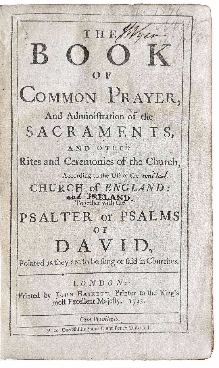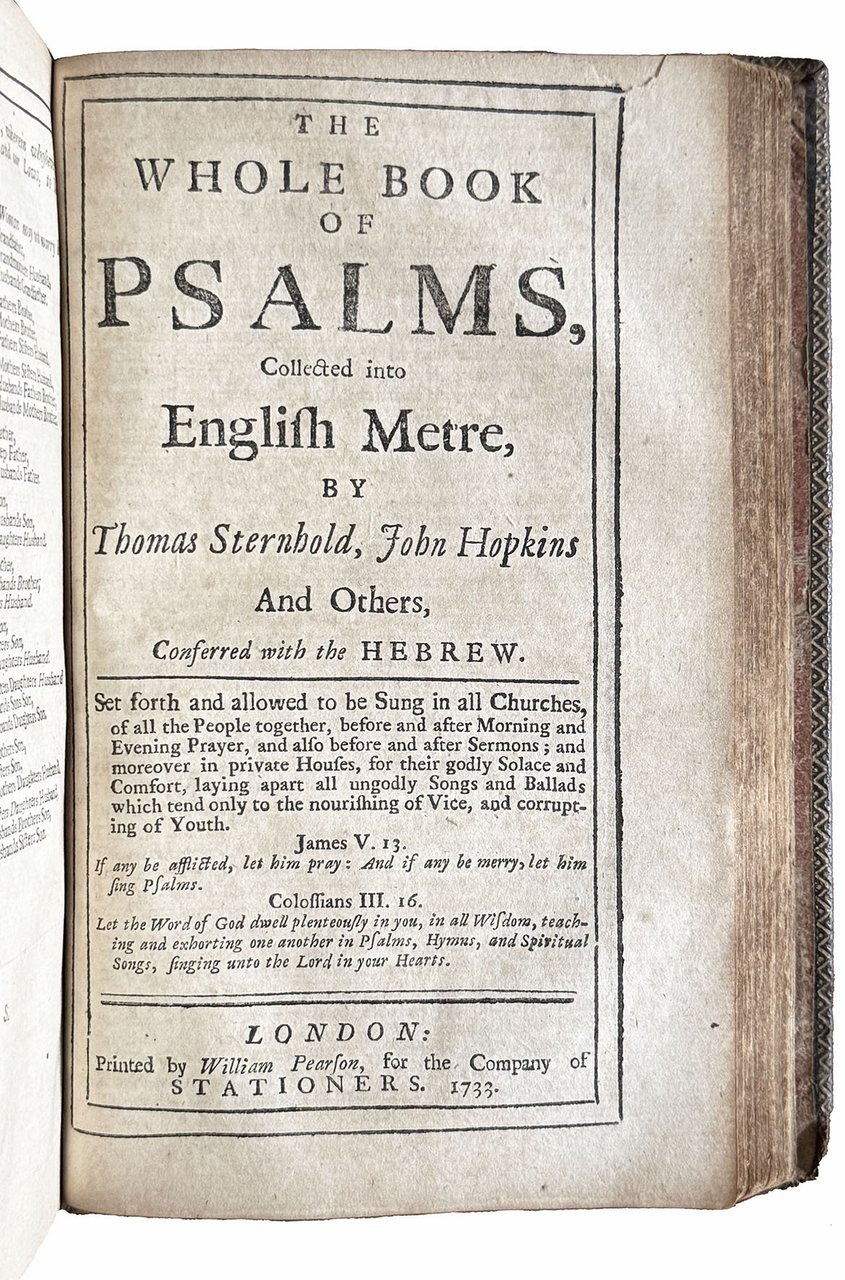THE WHOLE BOOK OF PSALMS, collected into English metre, by Thomas Sternhold, John Hopkins and others, conferred with the Hebrew. Set forth and allowed to be sung in all churches, of all the people together, before and after morning and evening prayer, and also before and after sermons; and moreover in private houses, for their godly solace and comfort; laying apart all ungodly songs and ballads, which tend only to the nourishing of vice, and corrupting of youth. London, Printed by William Pearson, for the Company of Stationers, 1733. 8vo. [128] pp. Collation: A-H8. Printed in two columns.