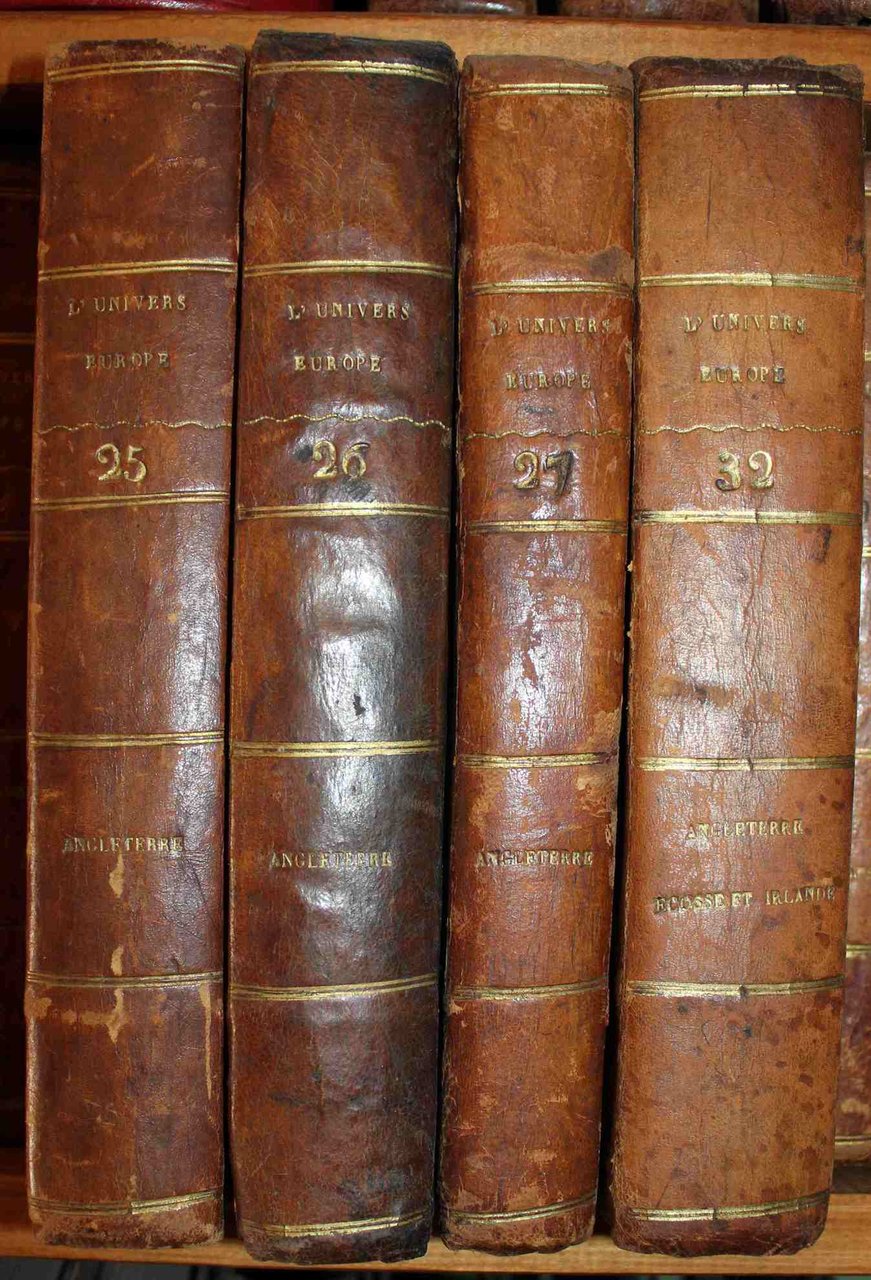 4 volumi in 8°, pp. 488 - 560 - 469 - 574. Con 1 carta geografica ripiegata (planisfero con l'impero britannico evidenziato a colori) e 175 tavole incise fuori testo (su 176, manca la n. 129 raffigurante la regina Anna) per l'Inghilterra, 1 carta e 26 tavole per la Scozia, 1 carta e 4 tavole per l'Irlanda. Legatura dell'epoca mezza pelle, dorso con titoli oro (L'Univers Pittoresque - Europe - T. 25, 26, 27, 32 - Angleterre - Angleterre, Ecosse, Irlande). Testo su due colonne. Fioriture e qualche alone ma copia in ordine. Opera appartenente a 'L'Univers Pittoresque, Histoire et Description de tous les Peuples, de leurs Religions, Moeurs, Coutumes Industrie'.