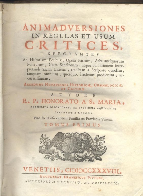 ANIMADVERSIONES IN REGULAS ET USUM CRITICES spectantes ad historiam ecclesiae, opera patrum, acta antiquorum martyrum, gesta sanctorum (…) Venetiis, Venezia, excudebat Franciscus Pitteri,1738.