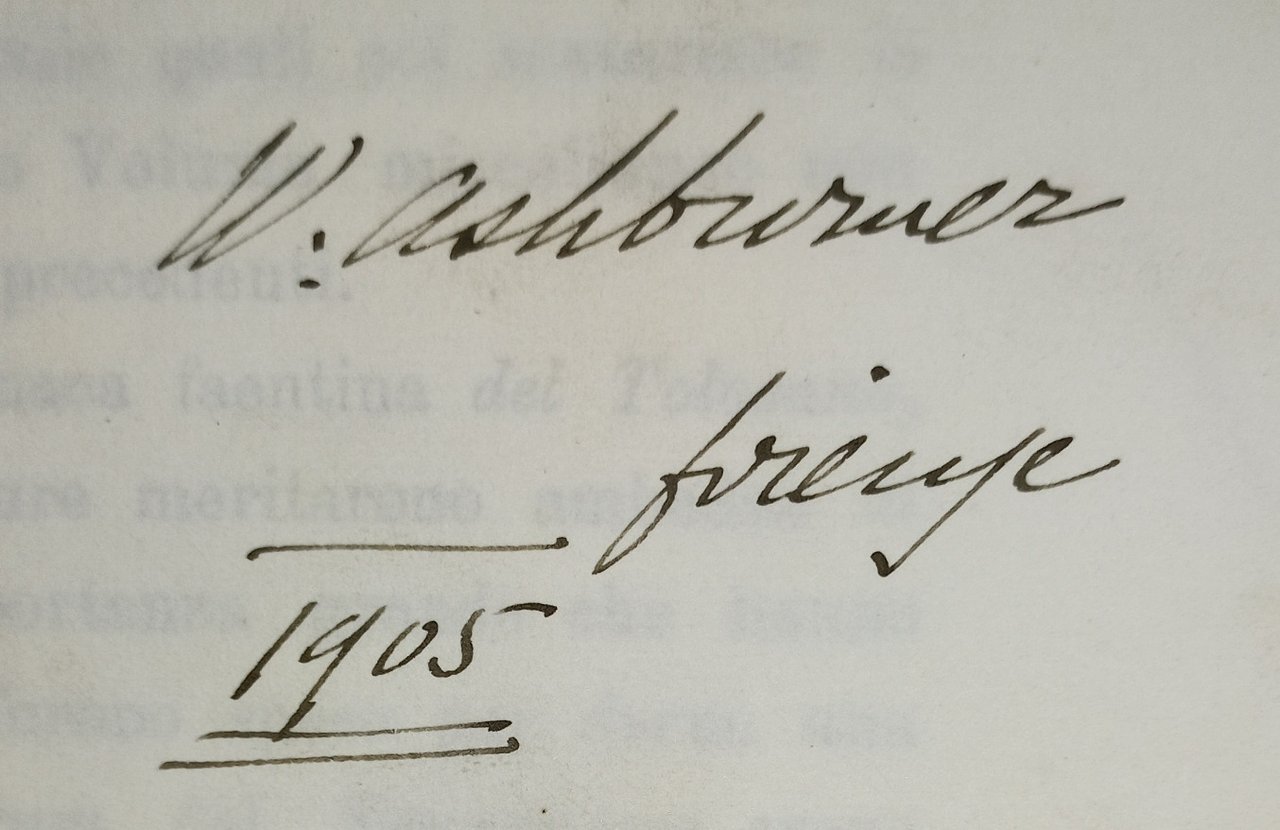 Rara ed erudita pubblicazione, stampata su carta distinta e in elegante veste tipografica. Buon esemplare, fresco e ad ampi margini. Tra i libri appartenuti al celebre collezionista, è curioso trovare un titolo relativamente recente, oltre che di argomento così specifico e di studio, rispetto alle Cinquecentine ed alle opere figurate che Ashburner ricercava.