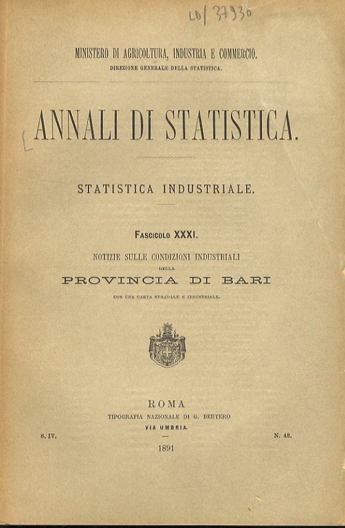 [Roma], Ministero di Agricoltura, Industria e Commercio (Stampa: Tipografia Nazionale di G. Bertero), 1893, in-8, br. editoriale (piccolo strappetto marginale), pp. 67, [1]. Con una carta a colori della provincia di Bari.