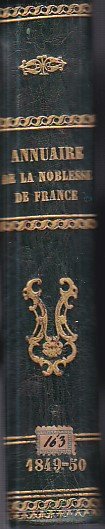 In-16°, pp. VIII, (8) di calendario per il 1850, 416, legatura coeva m. pelle verde cupo con titolo, filetti e fregi in oro al dorso. 3 tavole di blasoni incise f.t., di cui una in antiporta. Numerosissimi blasoni intercalati n.t. Ottimo stato. Edizione originale. Settima annata di questo dettagliato annuario araldico-genealogico della nobiltà di Francia e delle famiglie reali europee (esso fu pubblicato ininterrottamente dal 1843 al 1957). Contiene anche cenni di diritto nobiliare e sugli ordini cavallereschi. Il Borel d'Hauterive (Lione, 1812-Parigi, 1896) 'fonda la Revue historique de la noblesse de France (1841-1843) et publia l'Annuaire de la noblesse, qu'il avait fondé en 1843 sous le titre d'Annuaire de la pairie et qu'il dirigea jusqu'à sa mort survenue en mars 1896. Cette publication compte parmi les travaux les plus considérables publiés sur la noblesse, bien que certaines assertions, fournies par les familles, ne doivent pas être acceptées sans contrôle.' (D.B.F.). Saffroy, Bibliographie des almanachs et annuaires, n. 734.