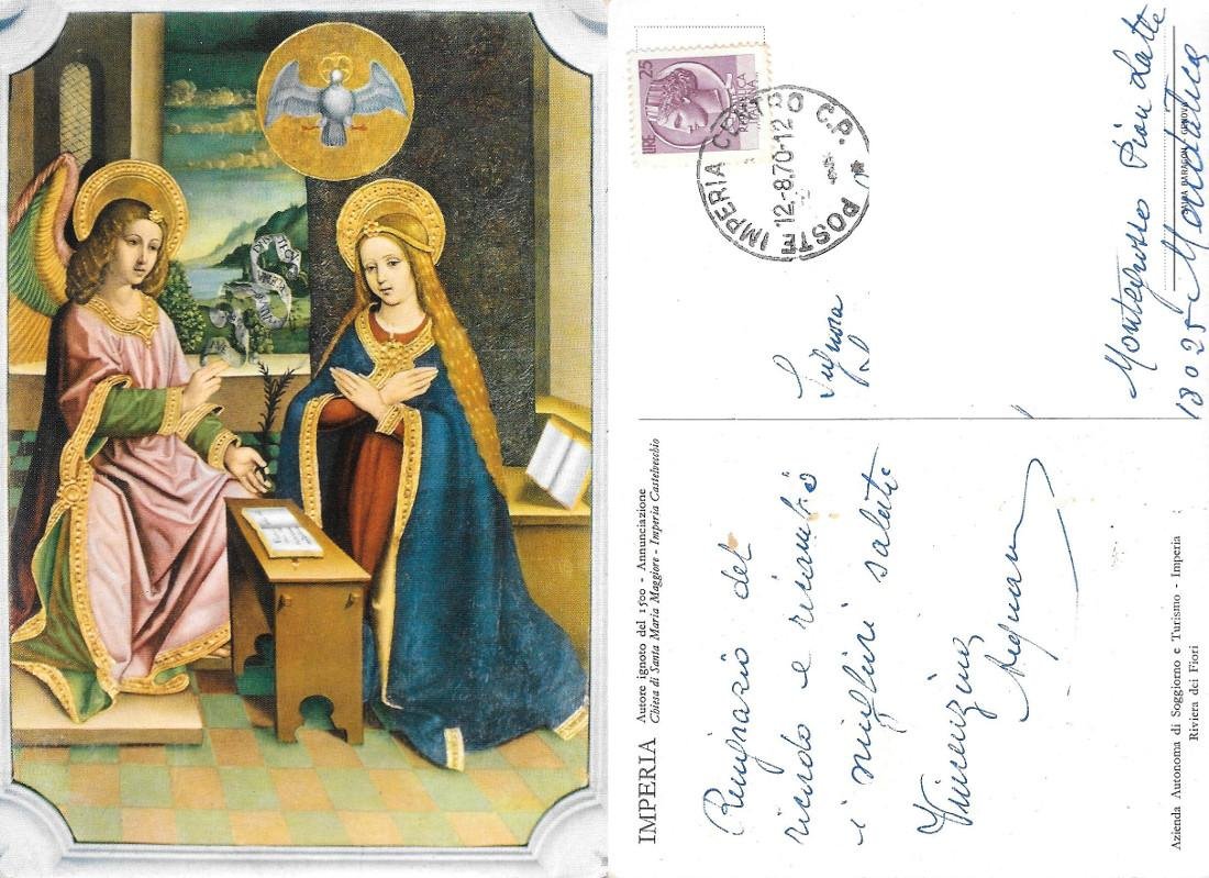 Annunciazione (ignoto 1500). Chiesa S. Maria Maggiore. Castelvecchio (IM). Viaggiata 1970