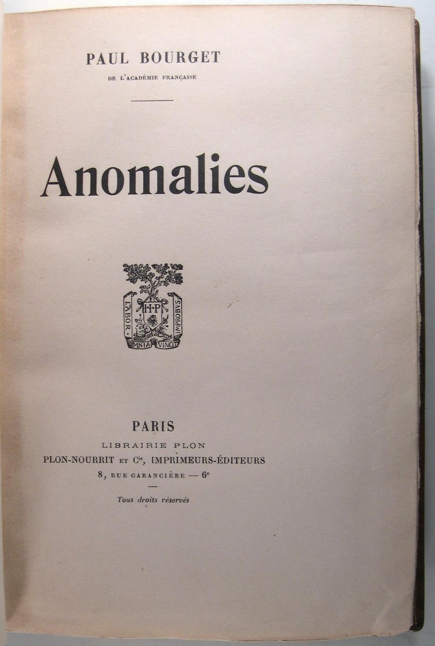 Edition Plon, Nourrit, Paris, 1920. In/8 reliure plein veau raciné, dos lisse à titre doré sous étui cartonné, gardes de soie à décor peigné, doré sur tête, couvertures et dos conservés, reliure de C. Lacaille, 308 pages. Exemplaire sur papier de Hollande van Gelder, à grandes marges (n°53/80). P. Bourget, (1852 - 1935) poète, romancier, critique, il a collaboré à la Revue des Deux Mondes, au Globe, à la Nouvelle Revue, à L'Illustration et divers autres journaux et revues. Ses Poésies ont été publiées en deux volumes ; ses principaux romans sont : Cruelle Énigme, André Cornélis, Un Crime d'amour, Mensonges, La Terre promise, Cosmopolis ; Paul Bourget a été élu à l'Académie en 1894.