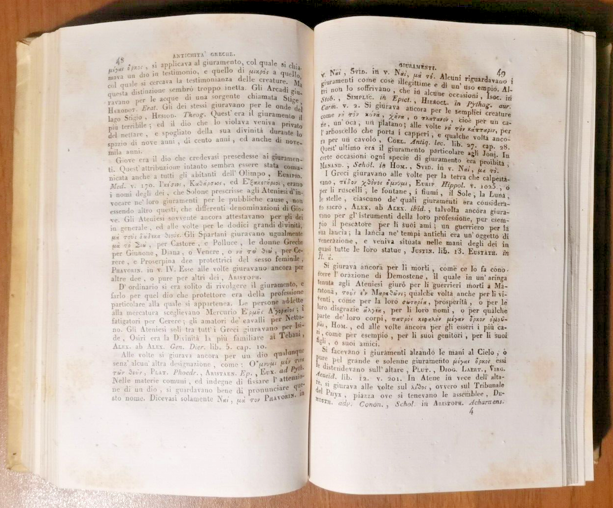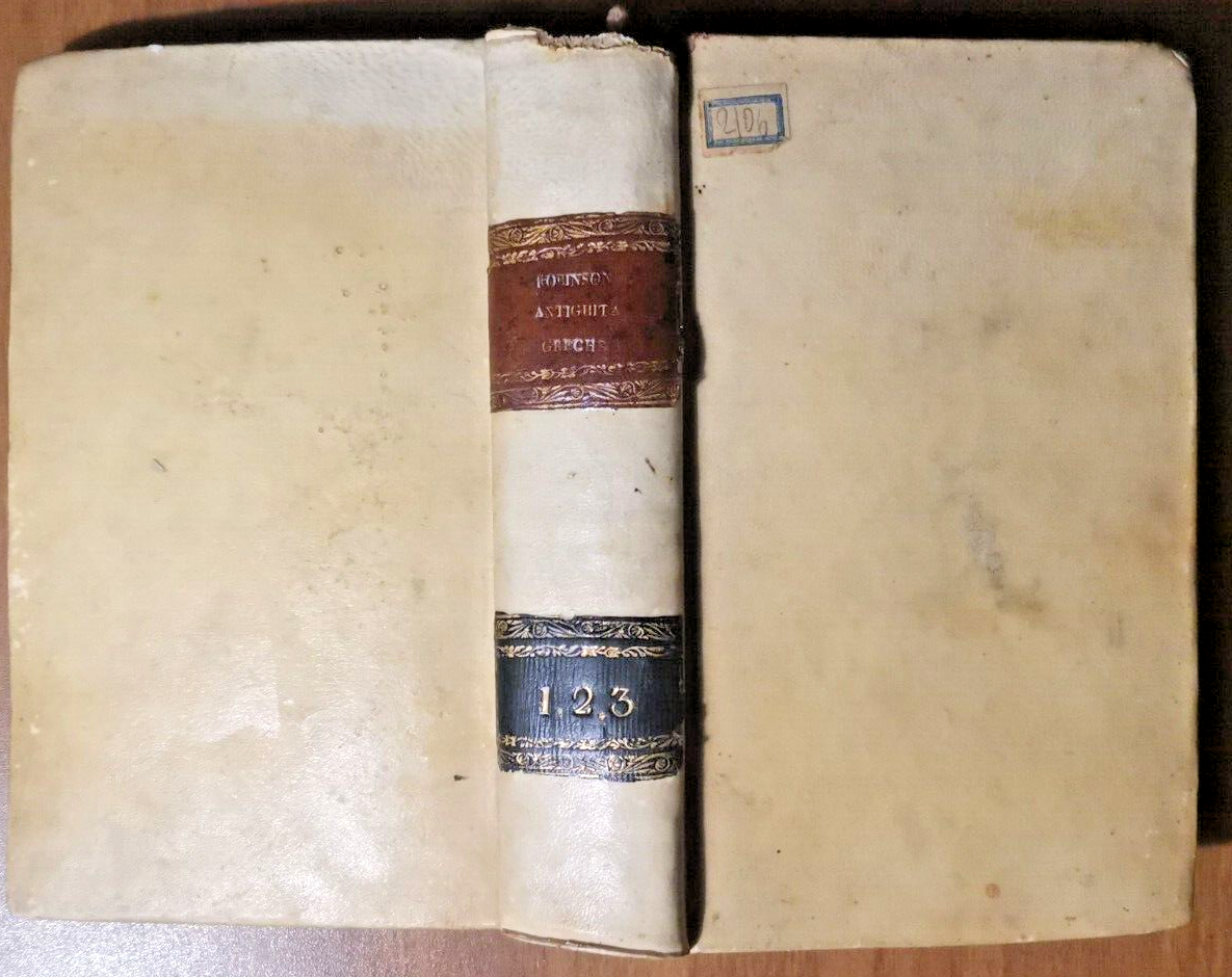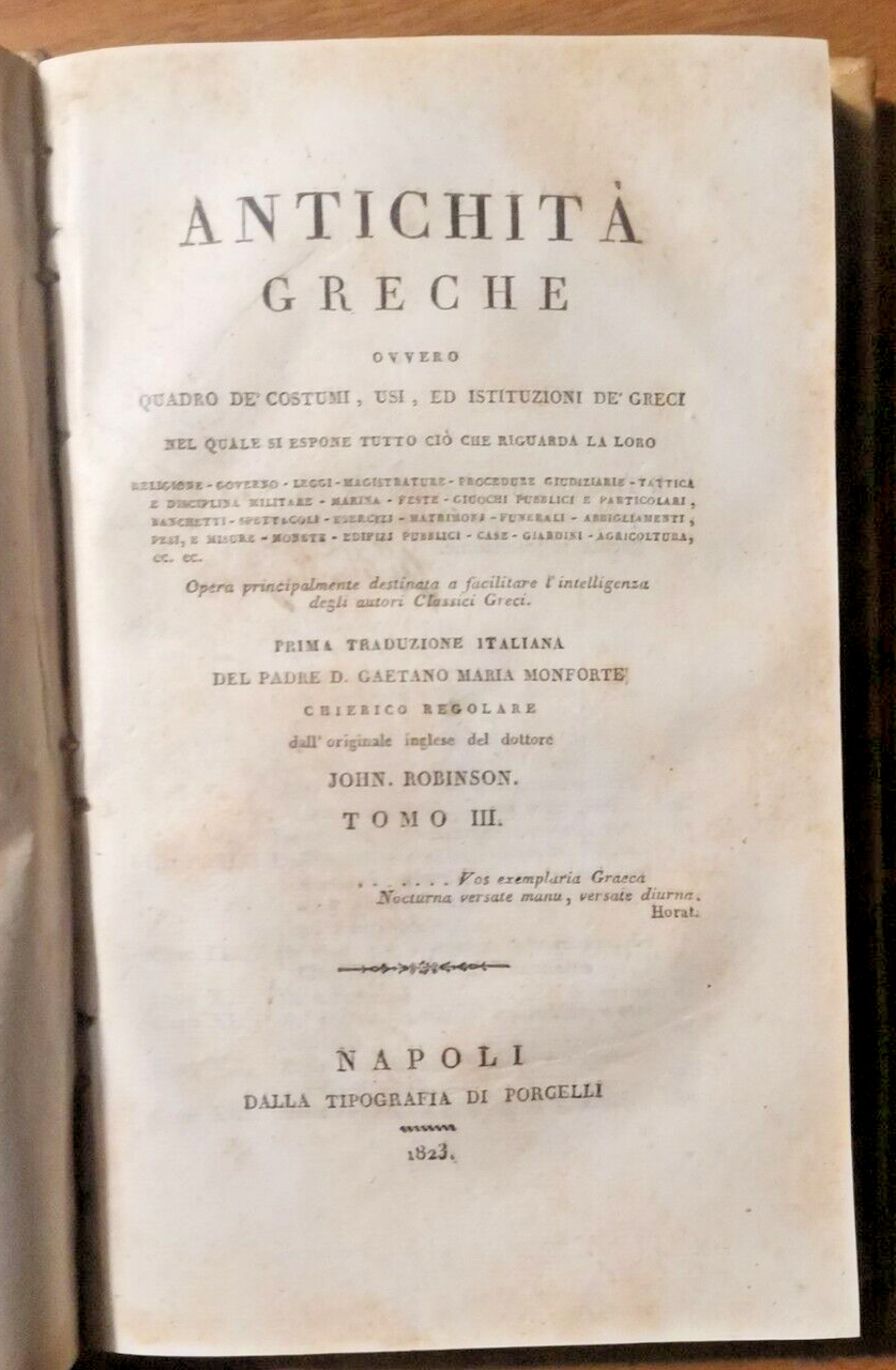 OPERA COMPLETA DI 3 VOLUMI RILEGATI INSIEME. ANTICHITÀ GRECHE ovvero Quadro de' costumi, usi, ed istituzioni de' greci nel quale si espone tutto ciò che riguarda la loro religione, governo, leggi, magistrature, procedure giudiziarie, tattica e disciplina militare, marina, feste, giuochi pubblici e particolari, banchetti, spettacoli, esercizj, matrimoni, funerali, abbigliamenti, pesi e misure, monete, edifizj pubblici, case, giardini, agricoltura ec.ec. Opera principalmente destinata a facilitare l'intelligenza degli autori classici Greci. PRIMA TRADUZIONE ITALIANA del Padre D. GAETANO MARIA MONFORTE dall'originale inglese del dottore JOHN ROBINSON
