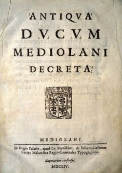 In folio (cm. 29,2), legatura coeva in cartonato d'attesa con titolo ms. al dorso (strappi al dorso senza alcuna perdita), pp. [20], 88, 93-348 [di 421, 3], stemma xilografico ducale al front., testatine e capilettera; carta ben conservata sebbene abbia qualche gora, una lieve mancanza al margine bianco laterale del front. e piccoli segni d'uso. Edizione originale della rara e importante opera giuridica che raccoglie i decreti dei duchi milanesi antecedenti le Constitutiones, in esemplare mancante di 2 carte interne e 38 finali. Libro incompleto ma genuino, da studio. (SF3)