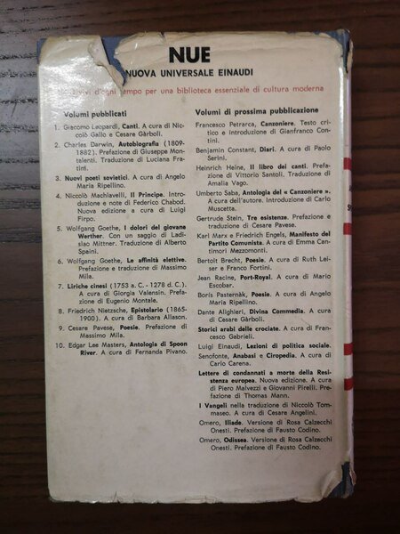 I edizione. Brossura editoriale. Discreto esemplare, segni di usura e primi tre fogli staccati dal dorso, ultimo foglio danneggiato. pp. 154.