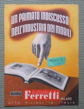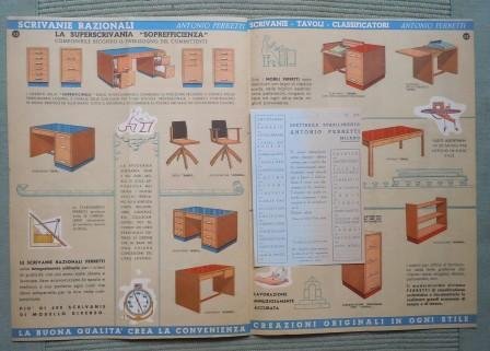 Catalogo listino della ditta Ferretti di Milano. Spillato, 28 cm, pp. 16. Ottime condizioni. Mobili classici, moderni, per schedari, per abitazione, scrivanie, cartelliere, mobiletti.