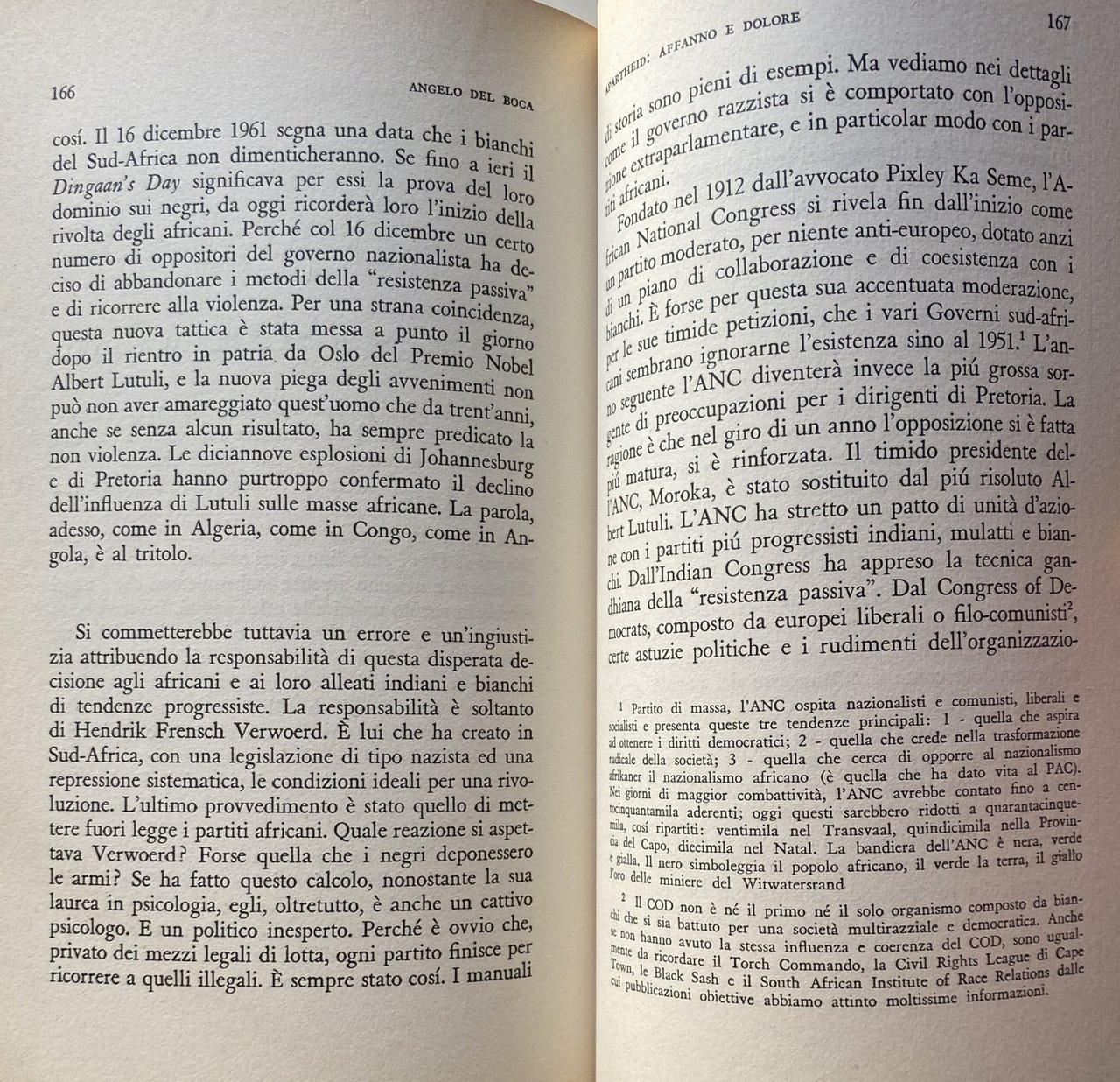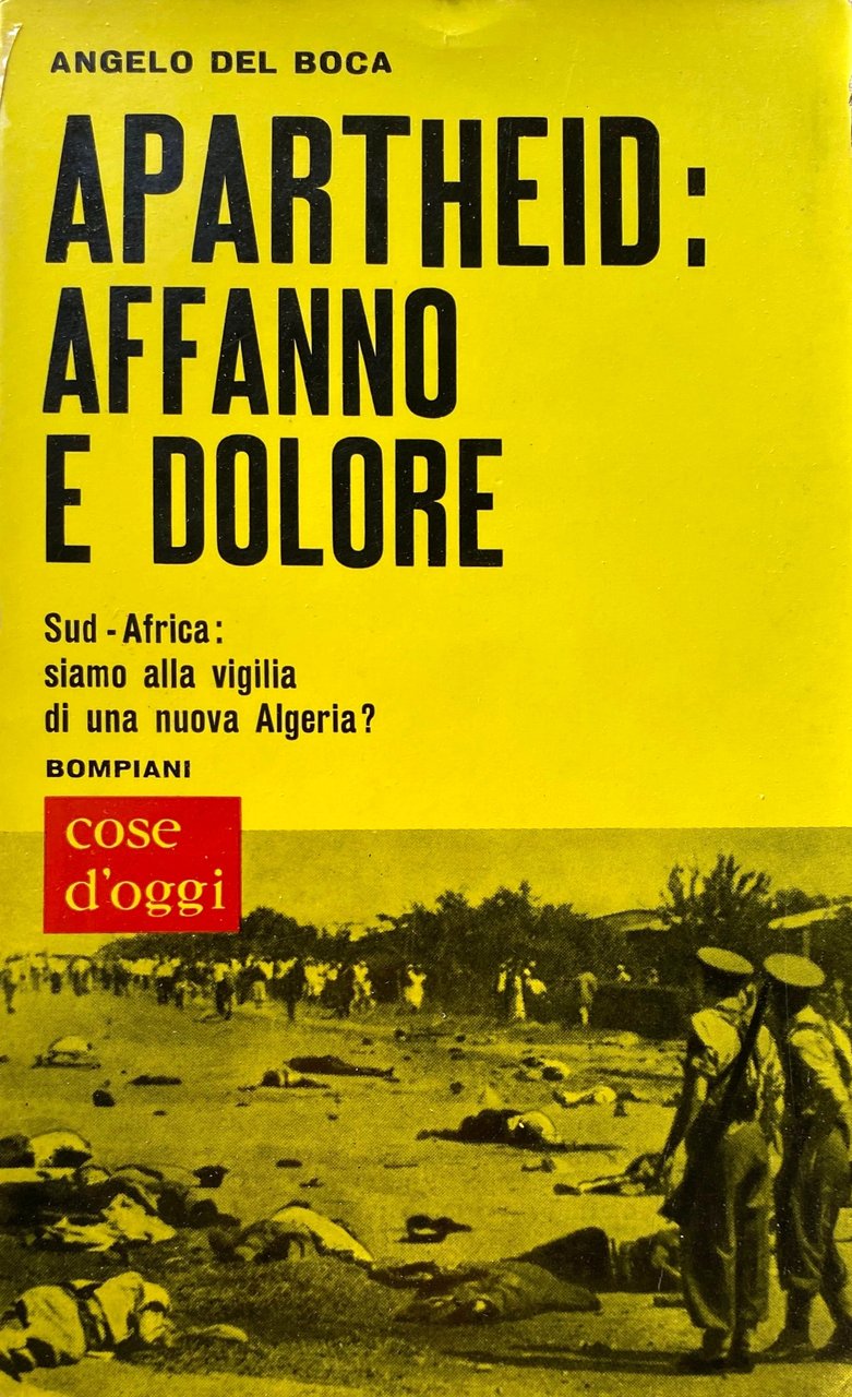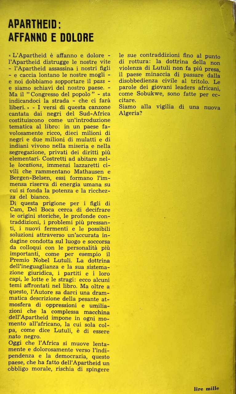 L'Apartheid è affanno e dolore l'Apartheid distrugge le nostre vite, l'Apartheid assassina i nostri figli e caccia lontano le nostre mogli e noi dobbiamo sopportare il pass e siamo schiavi del nostro paese. Ma il Congresso del popolo sta indicandoci la strada che ci farà liberi. I versi di questa canzone cantata dai negri del Sud-Africa costituiscono come un'introduzione tematica al libro: in un paese favolosamente ricco, dieci milioni di negri e due milioni di mulatti e di indiani vivono nella miseria e nella segregazione, privati dei diritti più elementari Costretti ad abitare nelle locations, immensi lazzaretti civili che rammentano Mauthausen e Bergen-Belsen, essi formano l'immensa riserva di energia umana su cui si fonda la potenza e la ricchezza del bianco. Di questa prigione per i figli di Cam, Del Boca cerca di decifrare le origini storiche, le profonde contraddizioni, i problemi più pressanti, i nuovi fermenti e le possibili soluzioni attraverso un'accurata indagine condotta sul luogo e soccorsa da colloqui con le personalità più importanti, come per esempio il Premio Nobel Lutuli. La dottrina dell'ineguaglianza e la sua sistemazione giuridica, i partiti e i loro capi, le lotte e le stragi: ecco alcuni temi affrontati nel libro. Ma oltre a questo, l'Autore sa darci una drammatica descrizione della pesante atmosfera di oppressioni e umiliazioni che la complessa macchina dell'Apartheid impone in ogni momento all'africano, la cui sola colpa, come dice Lutuli, è di essere nato negro. Oggi che l'Africa si muove lentamente e dolorosamente verso l'indipendenza e la democrazia, questo paese, che ha fatto dell'Apartheid un obbligo morale, rischia di spingere le sue contraddizioni fino al punto di rottura: In dottrina della non violenza di Lutuli non fa più presa, il paese minaccia di passare dalla disobbedienza civile al tritolo. Le parole dei giovani leaders africani, come Sobukwe, sono fatte per eccitare. Siamo alla vigilia di una nuova Algeria?