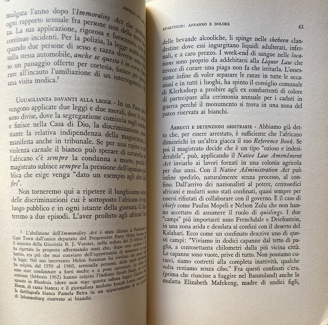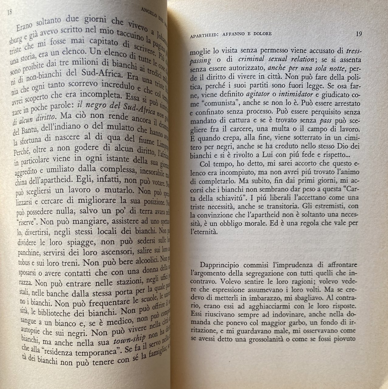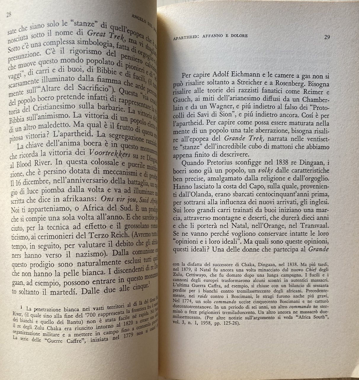 L'Apartheid è affanno e dolore l'Apartheid distrugge le nostre vite, l'Apartheid assassina i nostri figli e caccia lontano le nostre mogli e noi dobbiamo sopportare il pass e siamo schiavi del nostro paese. Ma il Congresso del popolo sta indicandoci la strada che ci farà liberi. I versi di questa canzone cantata dai negri del Sud-Africa costituiscono come un'introduzione tematica al libro: in un paese favolosamente ricco, dieci milioni di negri e due milioni di mulatti e di indiani vivono nella miseria e nella segregazione, privati dei diritti più elementari Costretti ad abitare nelle locations, immensi lazzaretti civili che rammentano Mauthausen e Bergen-Belsen, essi formano l'immensa riserva di energia umana su cui si fonda la potenza e la ricchezza del bianco. Di questa prigione per i figli di Cam, Del Boca cerca di decifrare le origini storiche, le profonde contraddizioni, i problemi più pressanti, i nuovi fermenti e le possibili soluzioni attraverso un'accurata indagine condotta sul luogo e soccorsa da colloqui con le personalità più importanti, come per esempio il Premio Nobel Lutuli. La dottrina dell'ineguaglianza e la sua sistemazione giuridica, i partiti e i loro capi, le lotte e le stragi: ecco alcuni temi affrontati nel libro. Ma oltre a questo, l'Autore sa darci una drammatica descrizione della pesante atmosfera di oppressioni e umiliazioni che la complessa macchina dell'Apartheid impone in ogni momento all'africano, la cui sola colpa, come dice Lutuli, è di essere nato negro. Oggi che l'Africa si muove lentamente e dolorosamente verso l'indipendenza e la democrazia, questo paese, che ha fatto dell'Apartheid un obbligo morale, rischia di spingere le sue contraddizioni fino al punto di rottura: In dottrina della non violenza di Lutuli non fa più presa, il paese minaccia di passare dalla disobbedienza civile al tritolo. Le parole dei giovani leaders africani, come Sobukwe, sono fatte per eccitare. Siamo alla vigilia di una nuova Algeria?