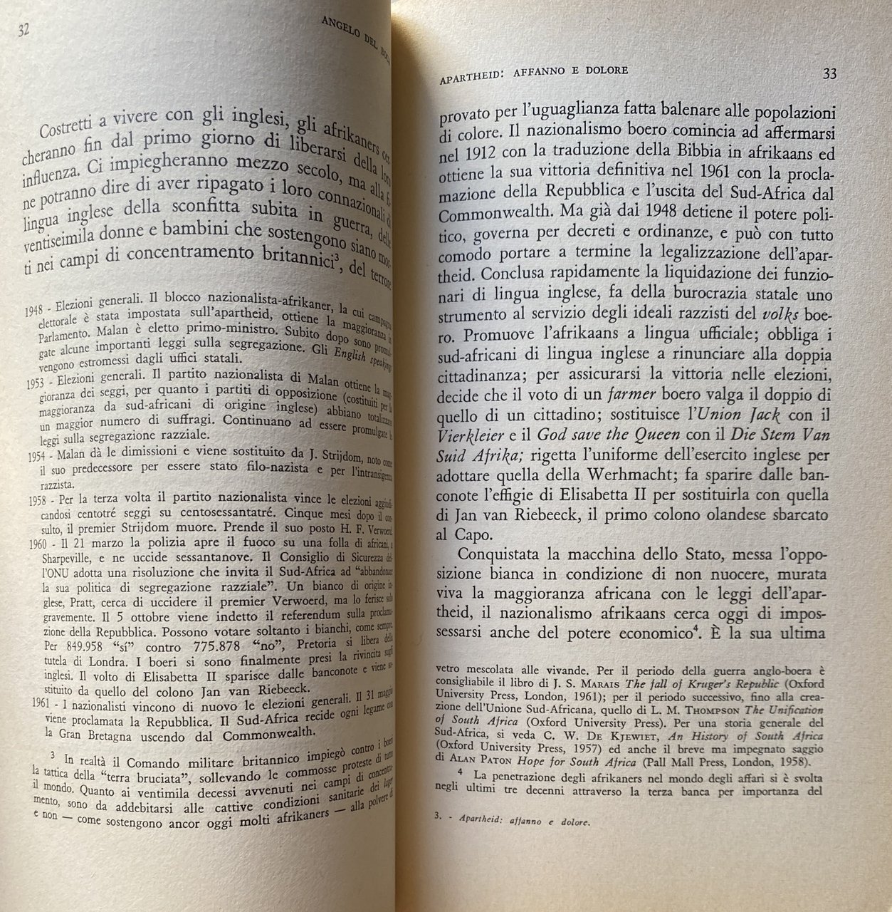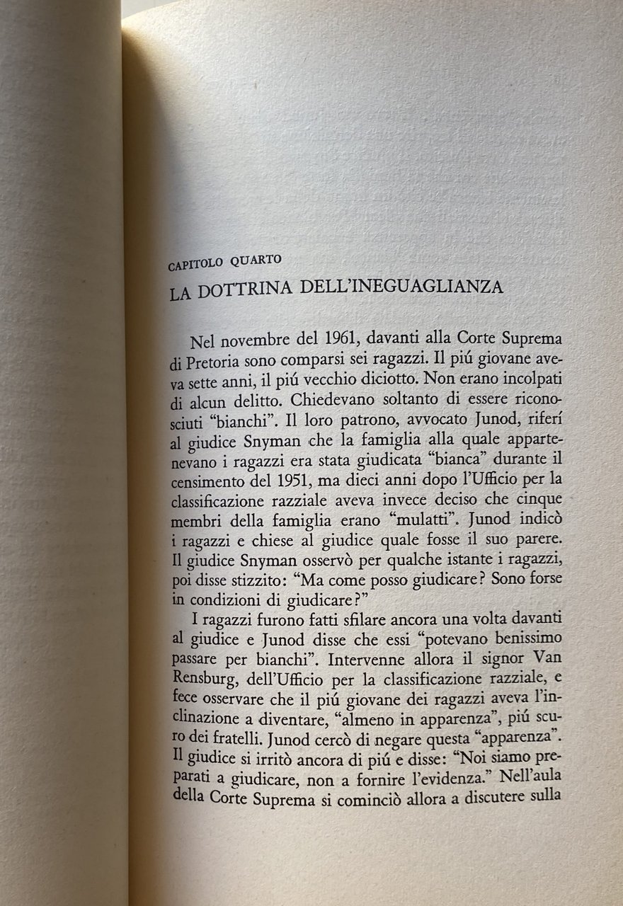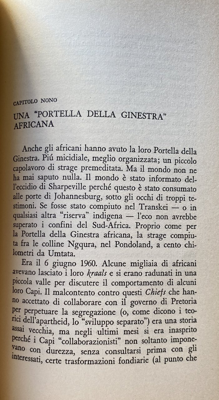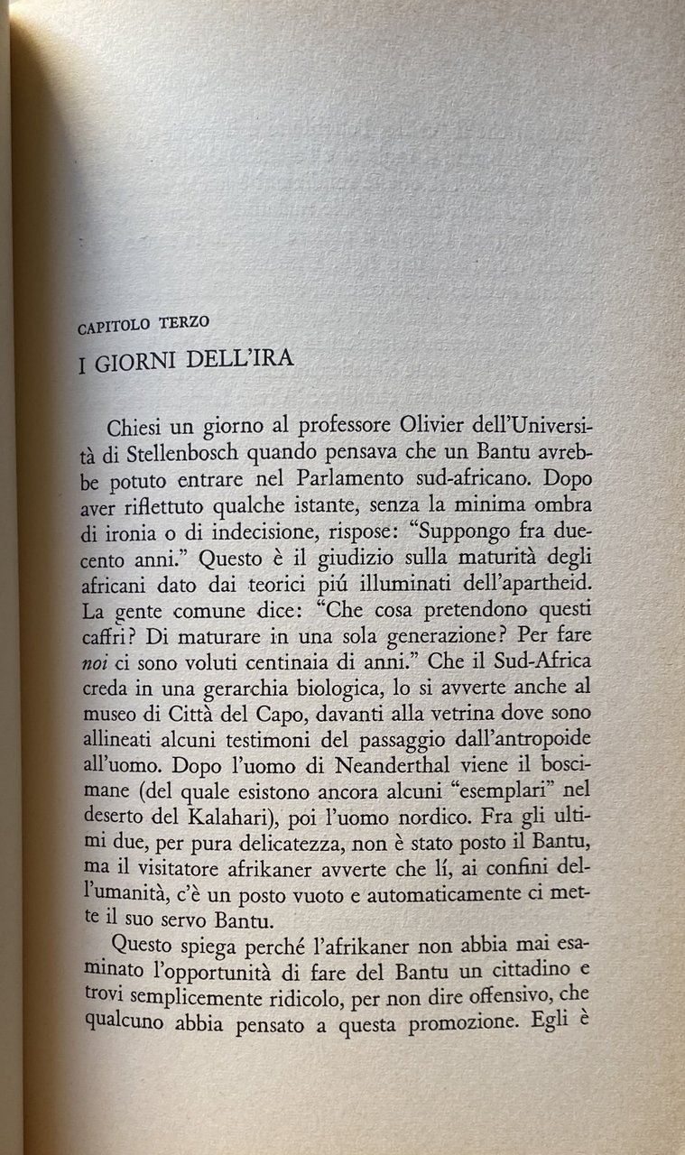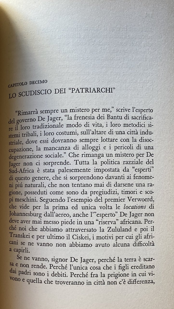 Soggetti: Storia contemporanea, Razzismo, Afrikaans, Supremazia bianca, Afrikaners Alan Paton Albert Lutuli ONU Areas Act Bantustans Bianchi Sud-Africa Bloemfontein Boeri Coloureds Cape Town Chief Chiesa Riformata Olandesi Ciskei Città Comunità Congress Diritto Durban Governo nazionalista Group Areas Groutville Helen Suzman Hendrik Frensch Verwoerd Hitler Indiani Inglesi Jo'burg Johannesburg ANC Leaders Leggi liberali Louw Malan Massacro Holomisa Sharpeville Mulatti Naicker Natal National Party Negri Parlamento Politica Polizia Pondoland Popolo Potere Premier Progressive Party Razza Razziale Razzisti Rhodesia Riserve Segregazione razziale Sharpeville Sir de Villiers-Graaff Smuts Sobukwe Sophiatown Stellenbosch Sudafricana Sviluppo Separazione Tomlinson Transkei Transvaal Tribali Umtata Verwoerd Voti Woerd Xhosa Reportage Saggi politici Collezionismo Libri rari Vintage fuori catalogo Politica Relazioni Internazionali Liberazione Emancipazione Diritti umani Occidente Bianchi Neri Società Discriminazioni Genocidio Anni Sessanta Daniel François Malan Namibia Johannes Gerhardus Strijdom Etnia Bantu Deportazioni Minoranze etniche Sabotaggio Rivolte Lotta politica Crimini Umanità Nelson Mandela Zulu Autobus Nonviolenza Disparità Proibizioni Divieti Matrimonio Istruzione Scuola Ingresso Lavoro Cittadinanza Leggi liberticide Libertà Homeland Tuisland Sviluppo Separate Development Sangue misto Cape coloured Self-Government Insediamenti Colonialismo Colonizzazione Imperialismo Township Baraccopoli Enclavi Gruppi etnici Sotho Diritti civili Swazi Marais Viljoen Ribelli Pogrom Disuguaglianza Dottrina Ideologie Patriarchi Guerra civile Disobbedienza Donne Isolamento Diplomazia Nazioni Unite Sfruttamento Riserve indigene Tribù Ghettizzazione Resistenza Malattie Miseria Fame Tubercolosi Slums Critica Condanna Kraals Repressione Eccidio Pretoria Xhosa bunga Nazionalismo Socialismo Marxismo Protettorato inglese Orange Commonwealth Boeri Voortrekkers Uprising Emigrazione Migranti Carta Negoziazioni Minatori Miniere Indipendenza Bophuthatswana Eugene de Kock Ossewabrandwag KaNgwane Keenan Sarakinsky KwaNdebele Lebowa Lennox Sebe Lucas Mangope Employment Smallholders Nobel Pace Gran Bretagna Regno Unito Inghilterra Contemporary history Racism White supremacy Whites South Africa Bloemfontein Boers Coloreds Reformed Church Dutch City Community Congress Law Nationalist Government Indians English Liberal laws Massacre Mulattos Blacks Parliament Politics Police People Power Premier Progressive Race Racial Racists Reserves Racial Segregation South African Development Separation Tribals Votes Political essays Collectibles Rare books out of print Politics International Relations Liberation Emancipation Human rights West Whites Blacks Society Discriminations Genocide 1960s Ethnicity Deportations Ethnic minorities Sabotage Riots Political struggle Crimes Humanity Buses Nonviolence Disparity Prohibitions Prohibitions Marriage Education School Entry Work Citizenship Liberticidal laws Freedom Development Separate Mixed blood Settlements Colonialism Colonization Imperialism Slums Enclaves Sotho Ethnic Groups Civil Rights Inequality Doctrine Ideologies Patriarchs Civil War Disobedience Women Isolation Diplomacy United Nations Exploitation Indigenous Reserves Tribes Ghettoization Resistance Diseases Poverty Hunger Tuberculosis Criticism Condemnation Repression Massacre Nationalism Socialism English Protectorate Boers Emigration Migrants Charter Negotiations Miners Mines Independence Peace Great Britain United Kingdom England