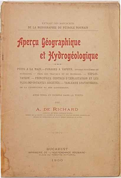 In 8° (cm. 23 x 16); pagg. 143; con tavole f.t. e illustrazioni n.t.; leggera cartonatura originale mancante del piatto poster., ma buono e solido. G+. ** Limon Danubien, puits à la main, systemes de sondages, evaluation des prix des sondages, resultats, exploitations, principaux cdentres d'exploitation (Campina, Reccea, Poiana, Tintea, Baicoi, Margurèlele, Steaua Romana). Estratto dai manoscritti della monografia "Pétrole Roumain".