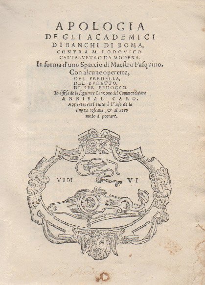 Apologia degli Academici di Banchi di Roma, contra M. Lodovico Castelvetro da Modena. In forma d’uno Spaccio di Maestro Pasquino. Con alcune operette del Predella, del Buratto, di Ser Fedocco. In difesa de la seguente Canzone del Commendatore Annibal Caro. Appertenenti tutte à l’uso de la lingua toscana, al vero modo di poetare