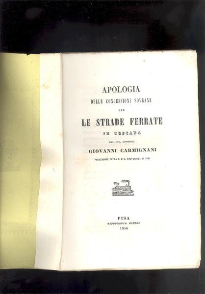 APOLOGIA DELLE CONCESSIONI SOVRANE PER LE STRADE FERRATE IN TOSCANA DEL CAV.<BR>COMMEND. GIOVANNI CARMIGNANI PROFESSORE DELLA I. E R. UNIVERSITA' DI PISA