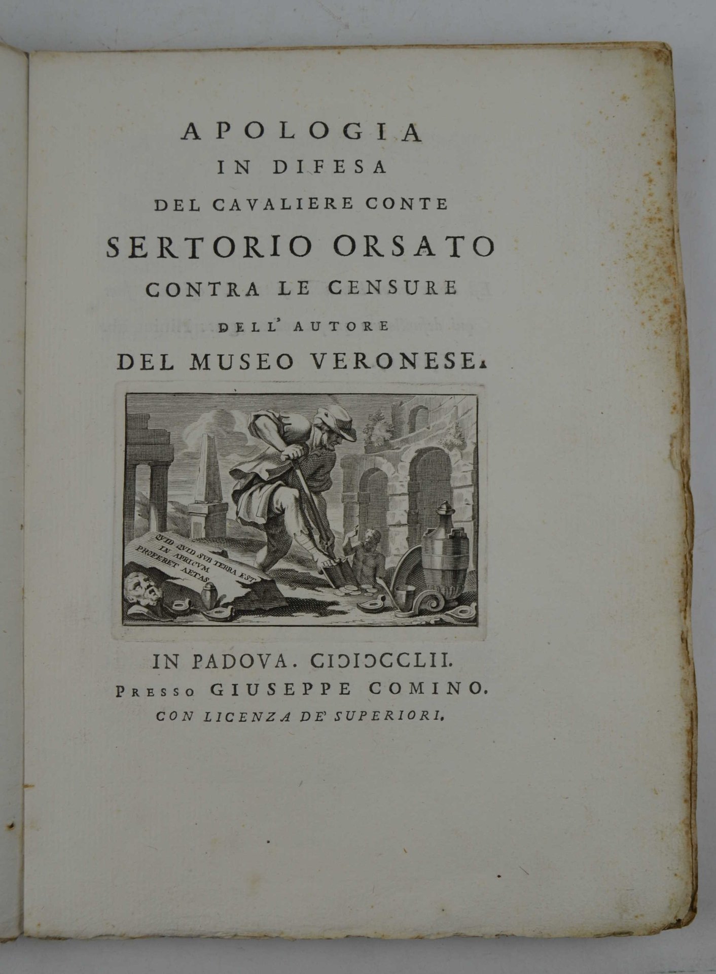 Cm. 27, pp. (8) 126 (2). Grande insegna tipografica incisa in rame al frontespizio, iniziali ornate, testate, finalini figurati. Leg. d'attesa in cartoncino azzurro. Esemplare fresco ed in eccellente stato di conservazione. Cfr. Federici 211/1; Olschki e Lozzi: "La interpretazione data dal Sertorio delle sigle di una romana iscrizione, che fu già del celebre Mons. Tomasini, diede argomento di censura al marchese S. Maffei nel suo Museo Veronese, al quale in questo libro si risponde in difesa di quella".