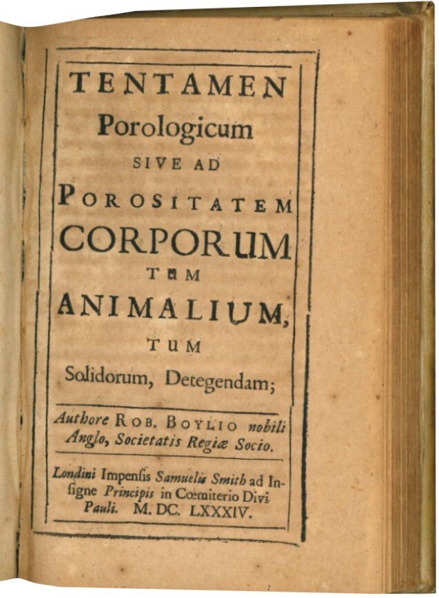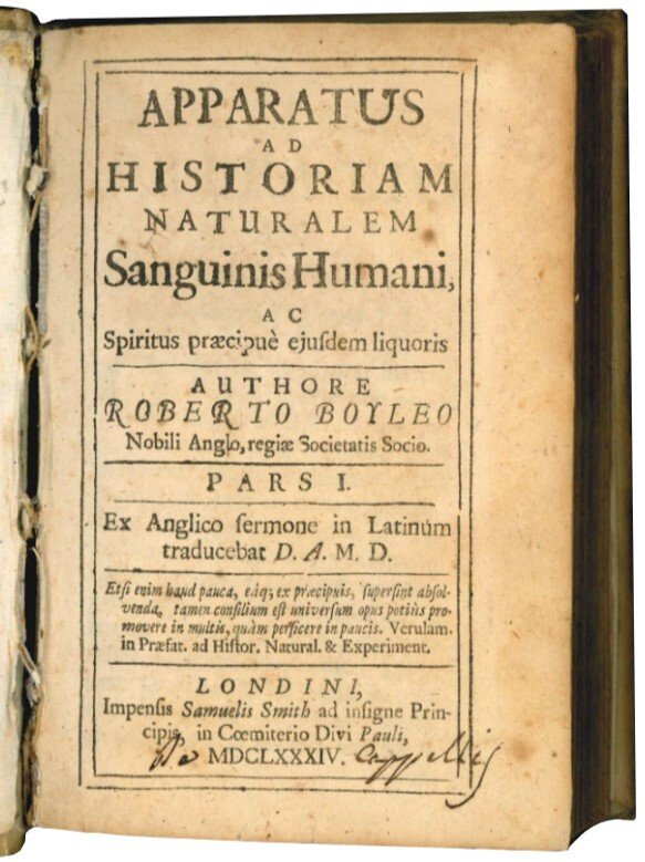 Apparatus ad Historiam naturalem Sanguinis Humani, ac Spiritus praecipuè ejusdem liquoris […] Pars 1. Ex Anglico sermone in Latinum traducebat D.A.M.D. […]. Legato con: Tentamen porologicum sive ad porositatem corporum tum animalium, tum solidorum, detegendam […].