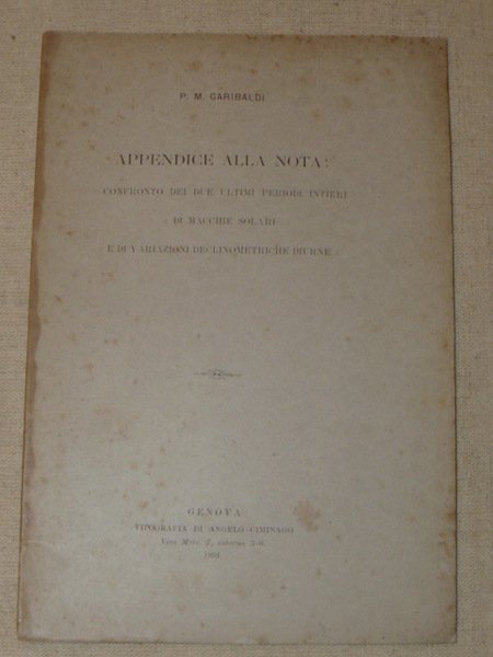 Appendice alla nota: confronto dei due ultimi periodi intieri 'di macchie solari e di variazioni declinometriche diurne'. Estratto agli atti della società Ligustica di Scienze naturali.