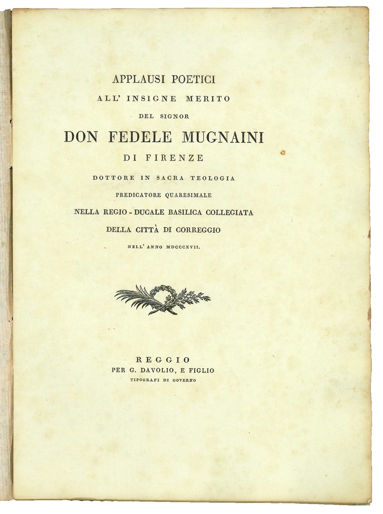 Applausi poetici all'insigne merito del signor don Fedele Mugnaini di Firenze, dottore in sacra teologia, predicatore quaresimale nella regio-ducale Basilica Collegiata della città di Correggio nell'anno MDCCCXVII