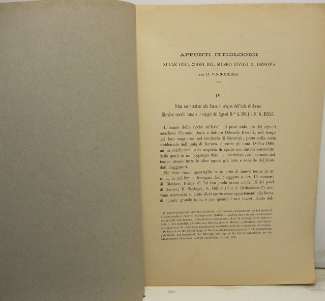 In 8, pp. 22 con ill. n.t. Dedica autogr. dell'A. al p. ant. Br. muta coeva. Catalogo di alcuni pesci raccolti dal marchese Giacomo doria e da Odoardo Beccari durante il loro soggiorno nel territorio di Sarawak sulla costa occidentale dell'isola del Borneo durante gli anni 1865-68.