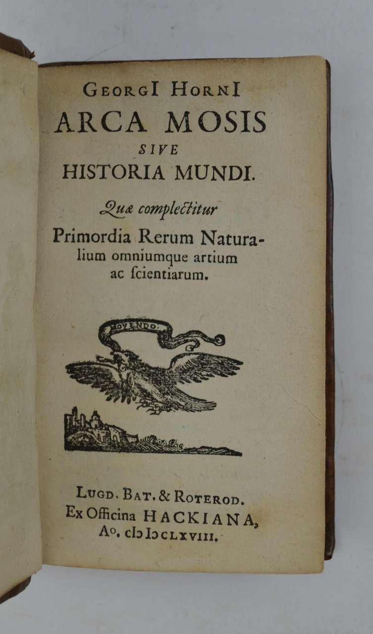Cm. 12, pp. (30) 220 (20). Antiporta interamente incisa in rame e fregio al frontespizio. Solida legatura settecentesca in piena pelle, dorso a nervi con titoli e fregi in oro. Cerniere abilmente restaurate, esemplare genuino e ben conservato. Edizione originale di questa curiosissima opera stilata dallo storico tedesco Georg Horn (1620-1670) in cui traspare il suo avvicinamento alle scienze alchemiche che caratterizzerà tutta la seconda parte della sua vita. Cfr. Ferguson e Caillet.
